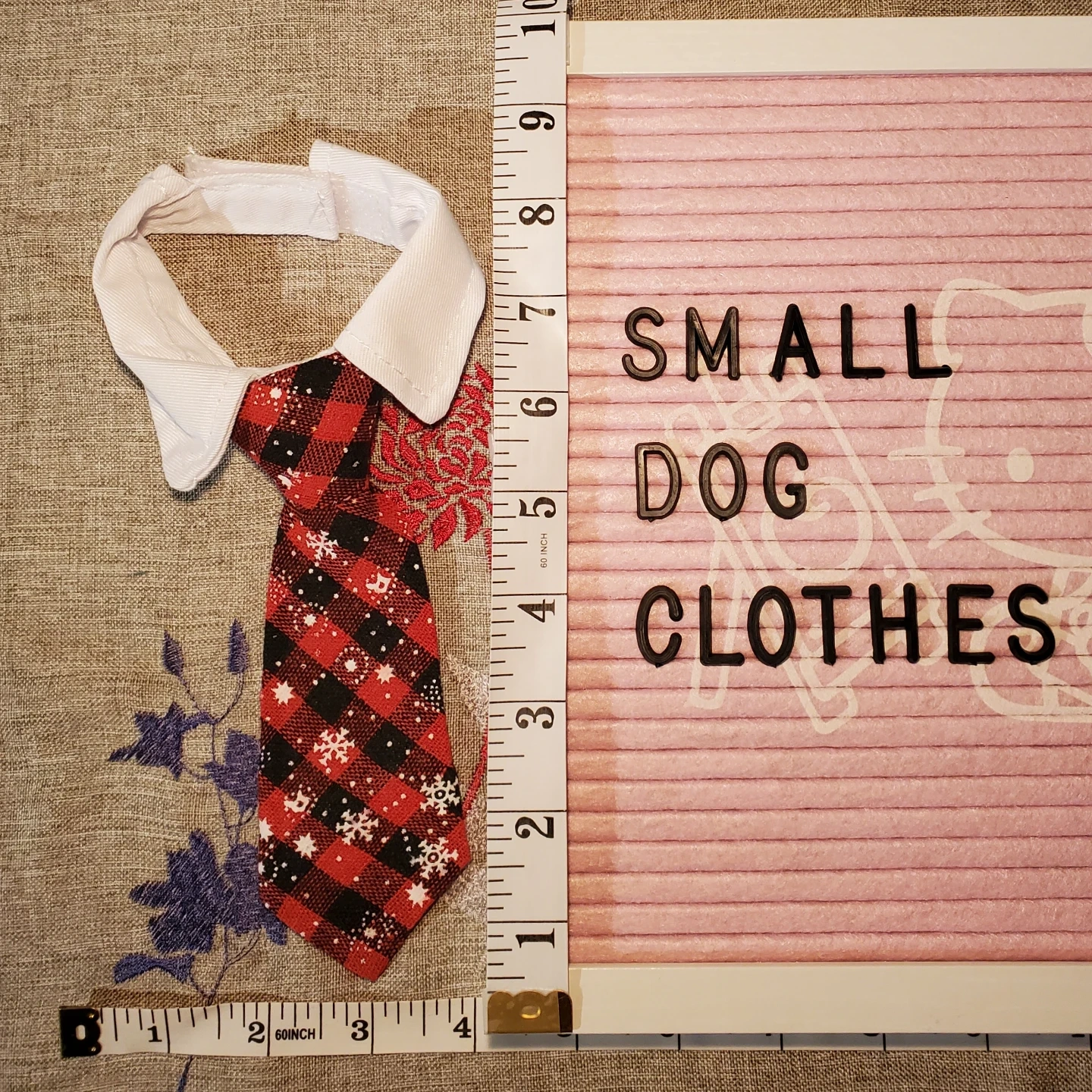 Holiday-themed red and black plaid tie with snowflake accents for small dogs. Features a white collar and adjustable neck strap.