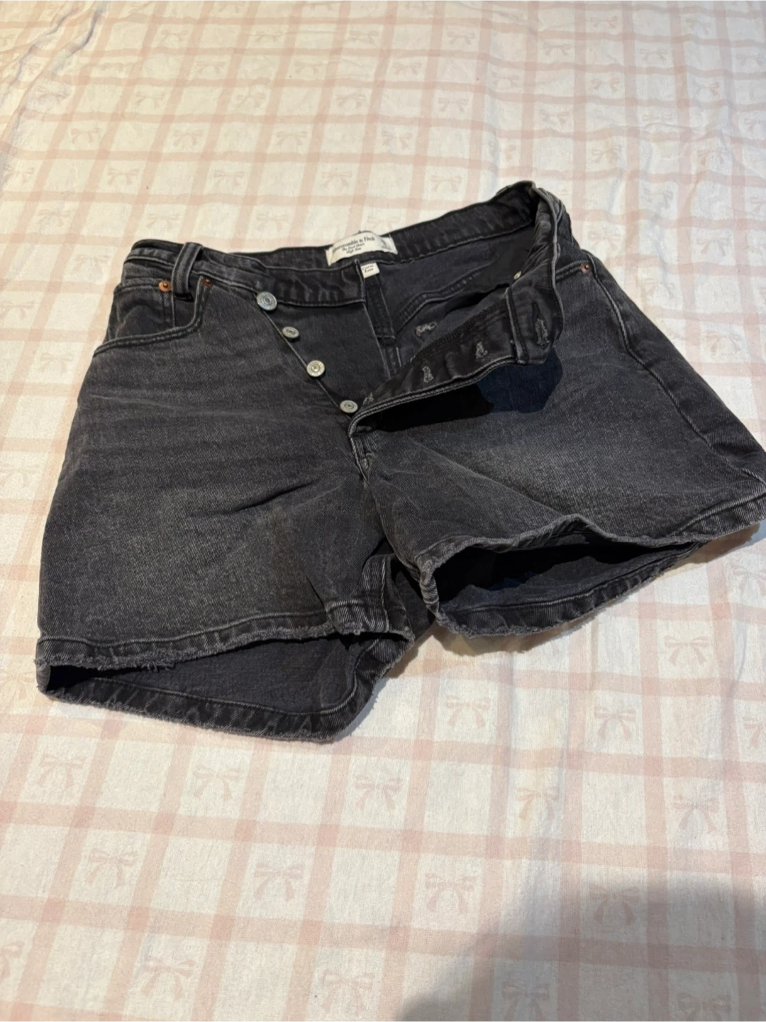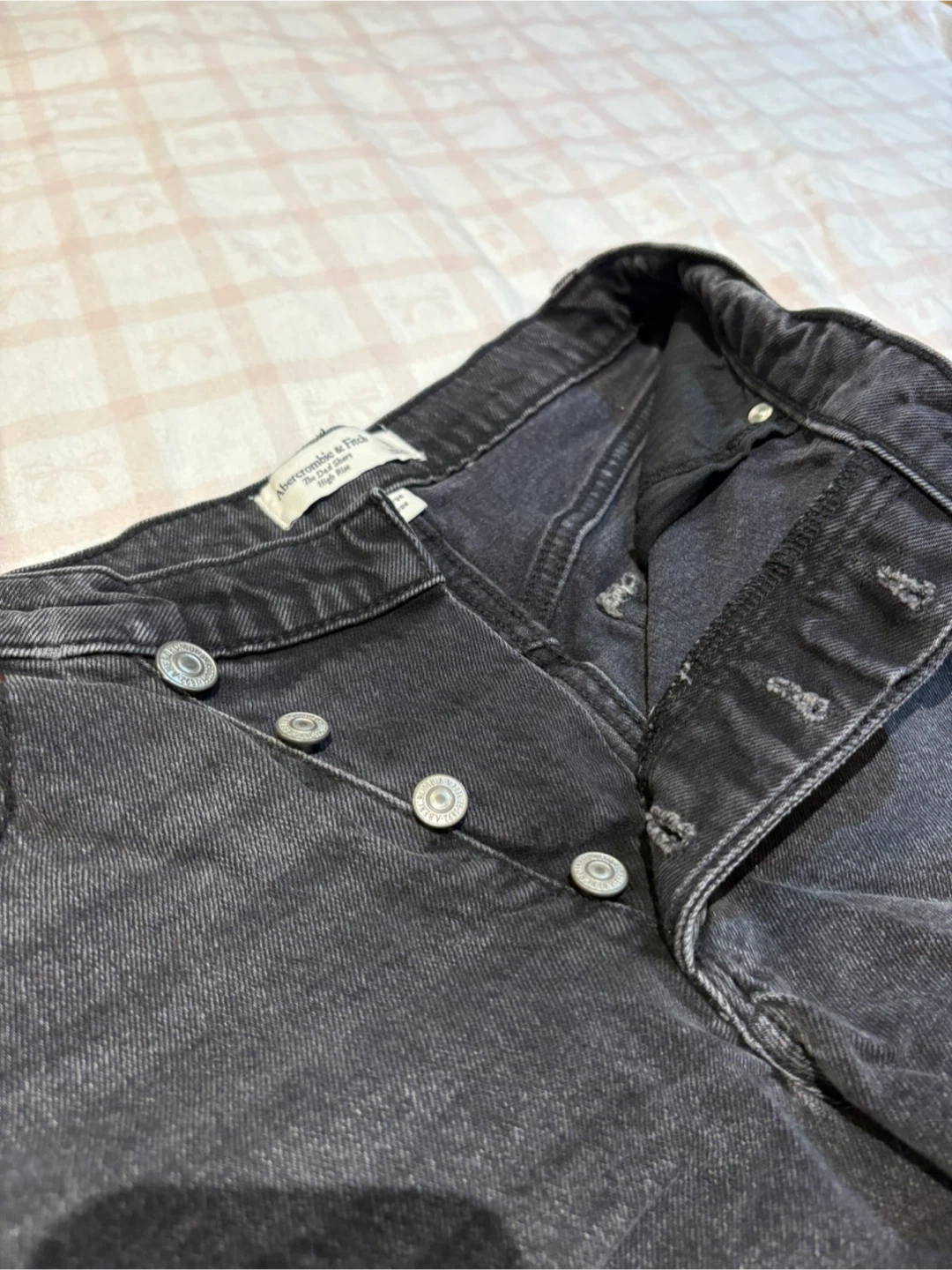 Women’s Abercrombie & Fitch denim shorts in a black wash. They feature a button-fly closure.