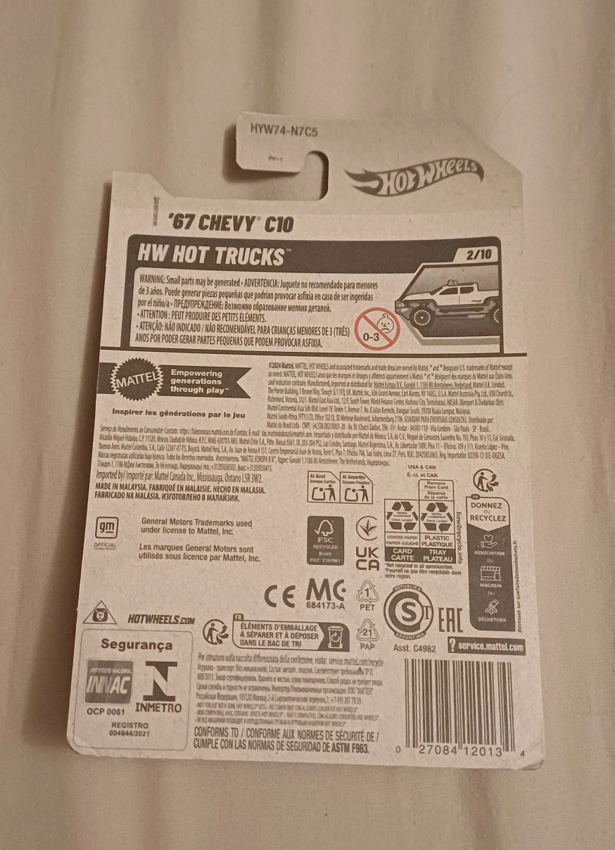 Selling a Hot Wheels '67 Chevy C10 from the HW Hot Trucks series! It's in its original packaging and ready for a new home. This model is suitable for ages 3 and up. A great addition to any Hot Wheels collection!