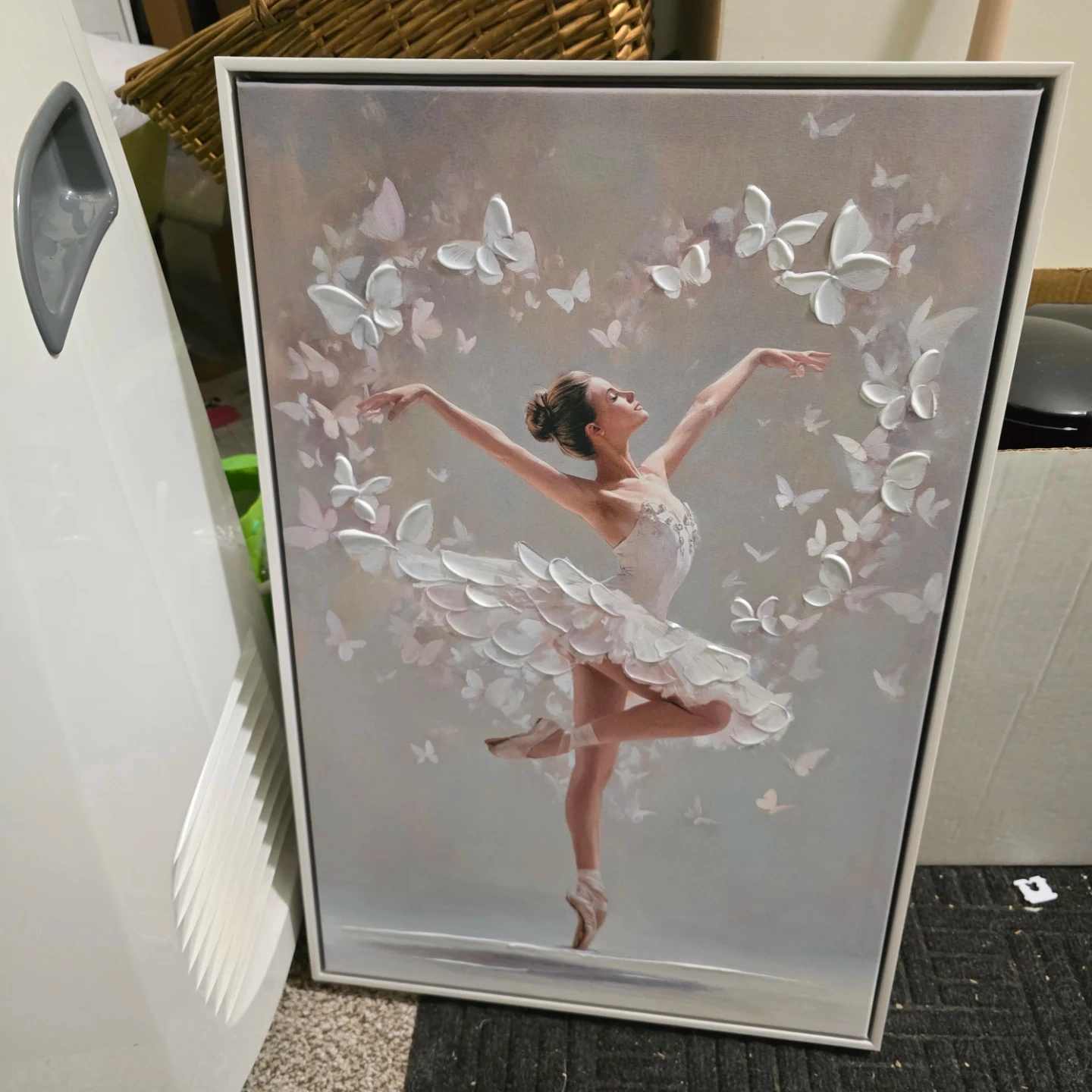 This canvas wall art features a 3D textured design of a ballerina surrounded by butterflies. It's framed and ready to hang. Adds a touch of elegance to any room!