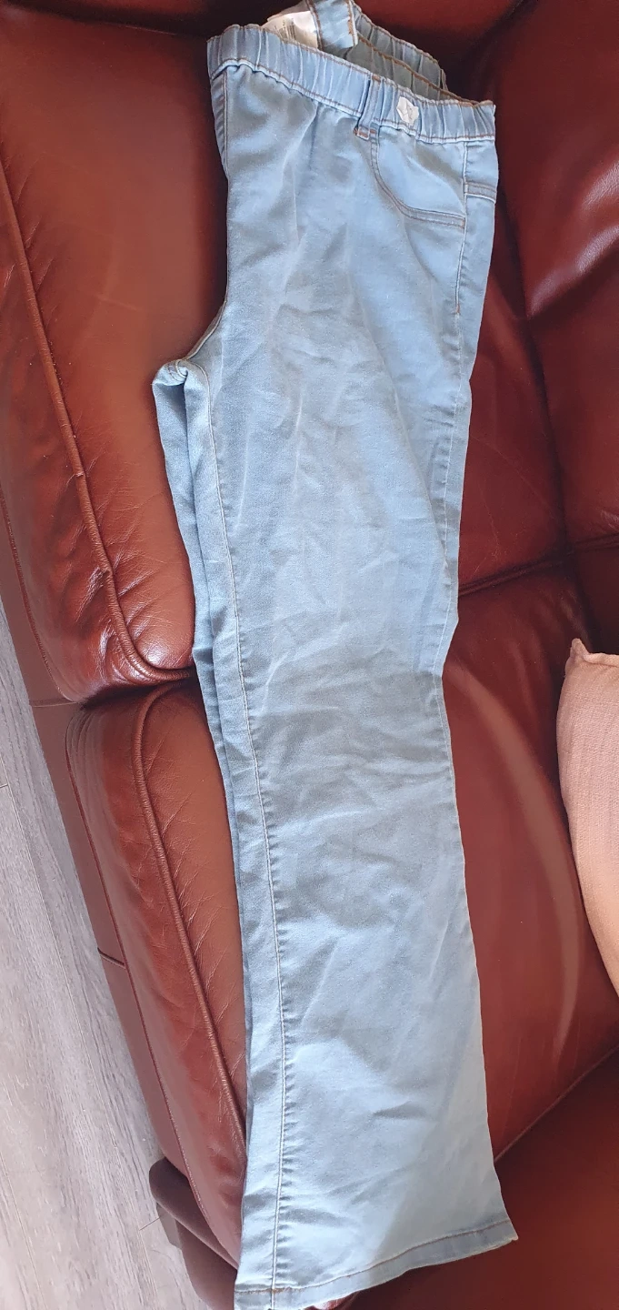 Light wash denim jeans with an elastic waistband. Made in Pakistan. Size L fits a EUR 52, USA 20, and RUS/UA 62.