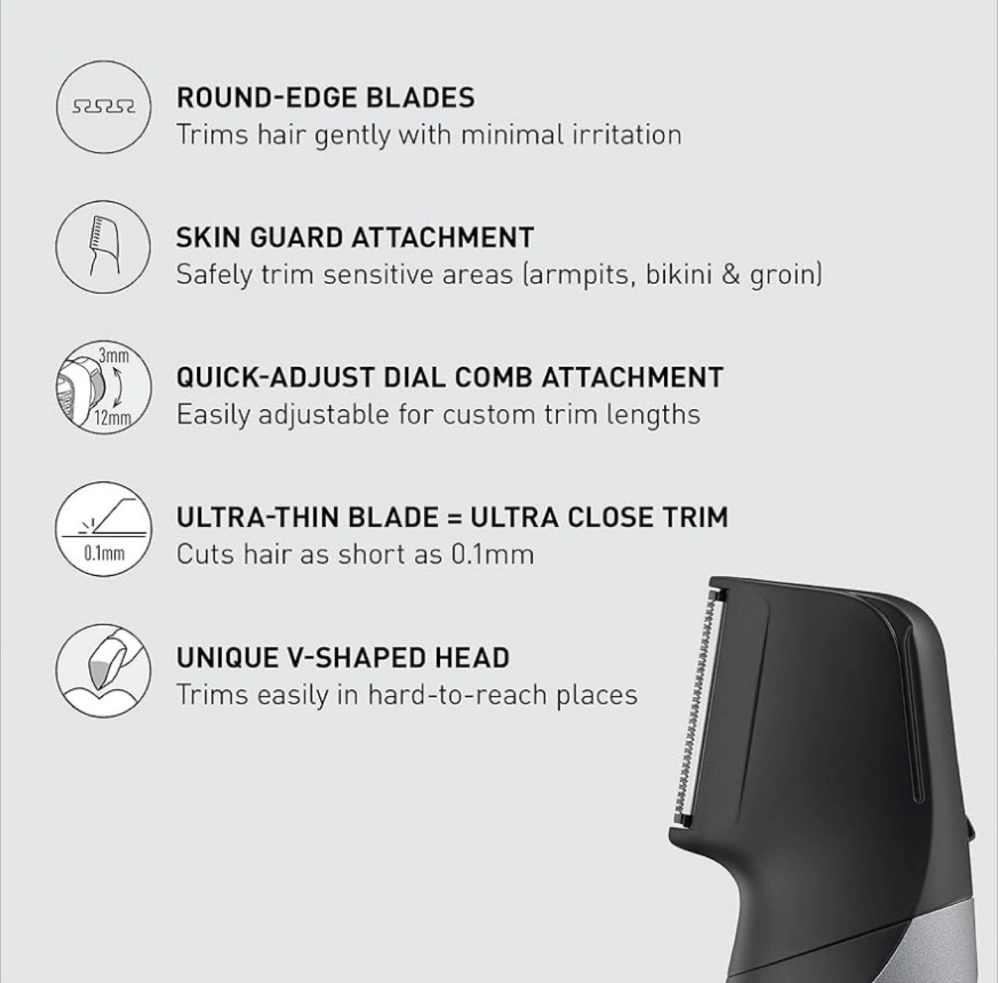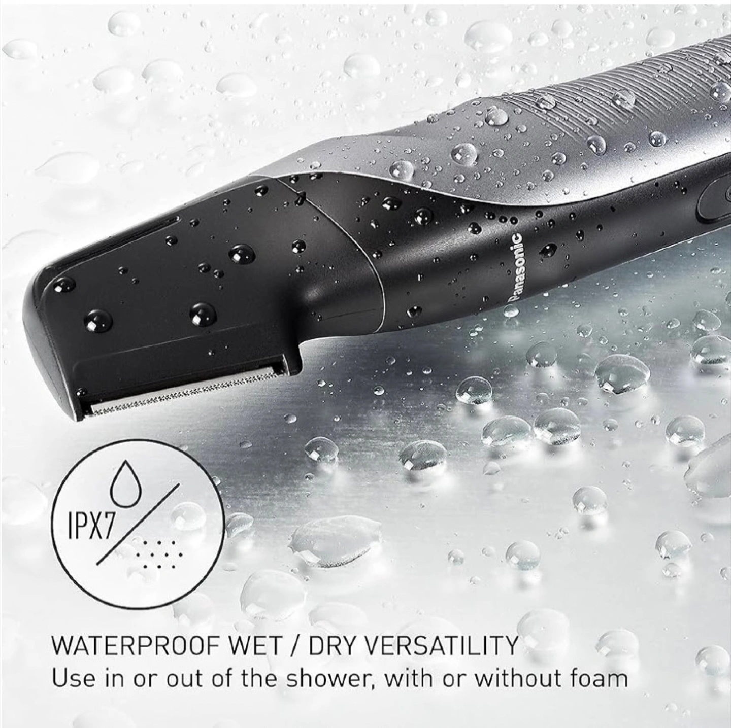 Fully waterproof groomer is made for body hair trimming convenience, dry or in the shower