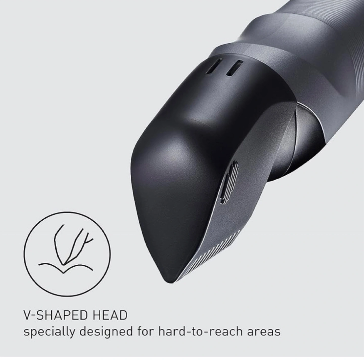 Slim, easy to hold I-shaped sure-grip handle ensures detailed grooming; V-shaped head easily grooms hard-to-trim areas