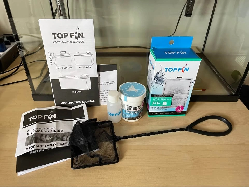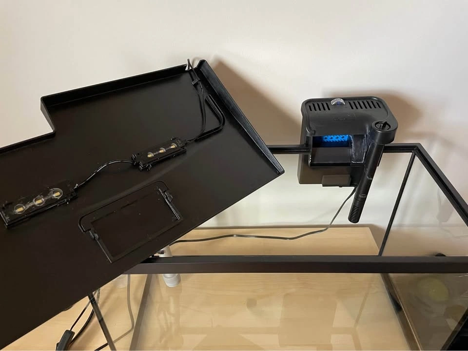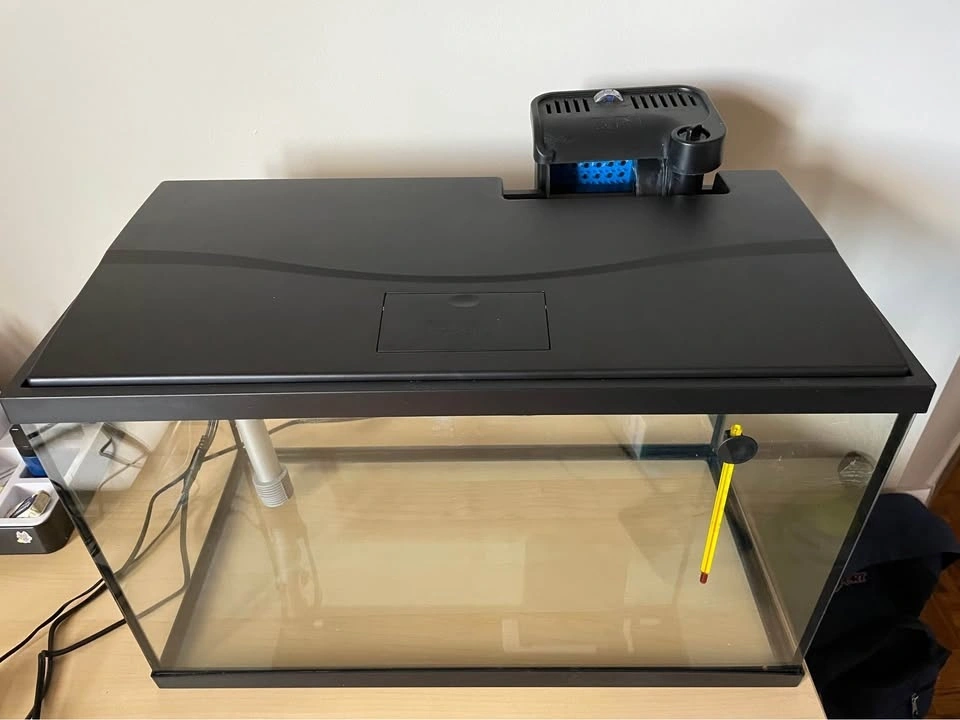 Less than a year old. Moving away and can’t take the tank with me 😢. Lights, heater and filter works! I have an extra filter, more than half a container of food for tropical fish, brand new black net (never been used) and a variety of plants and decor, including 2 bags worth of pebbles that fill the 10 gallon tank.