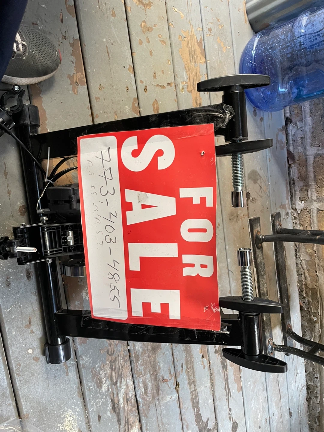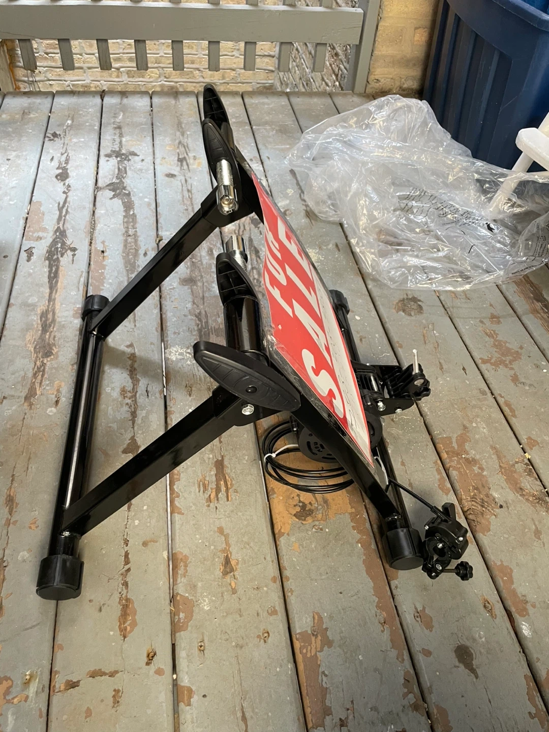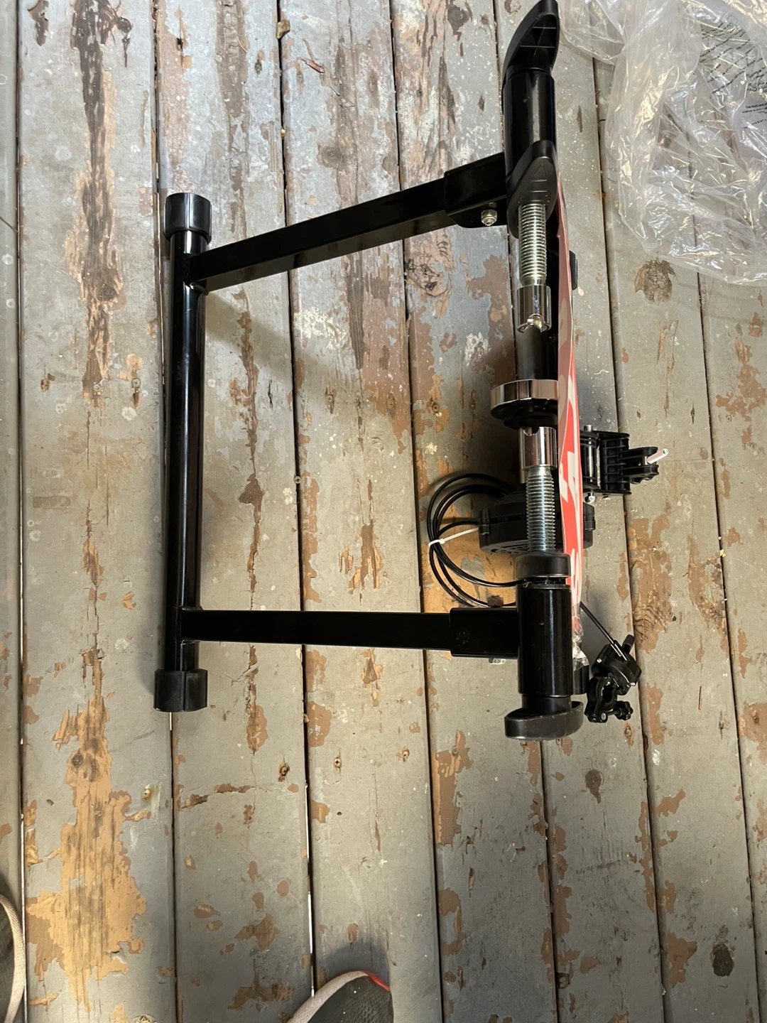 This is a black metal bicycle trainer stand. It's made of durable metal and has adjustable clamps. Great for indoor cycling training!