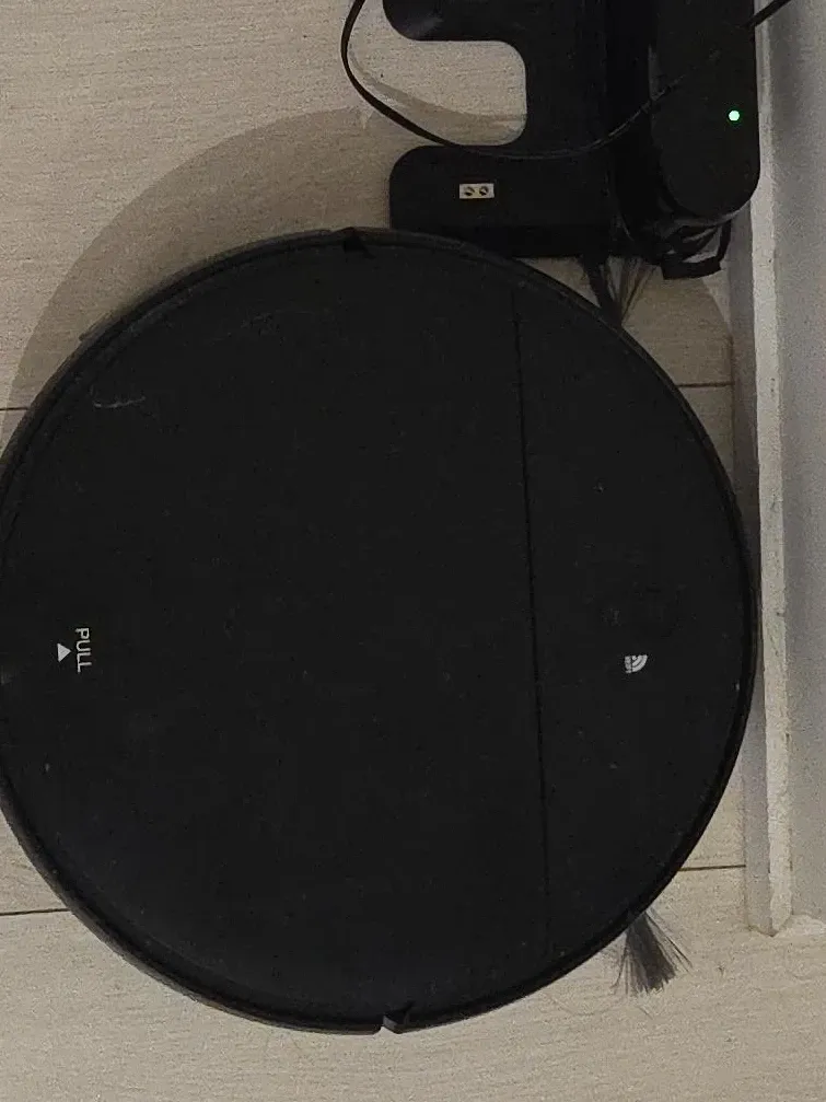 This black robot vacuum cleaner is designed for automated floor cleaning. It comes with a charging dock. This unit is great for keeping your floors tidy with minimal effort.