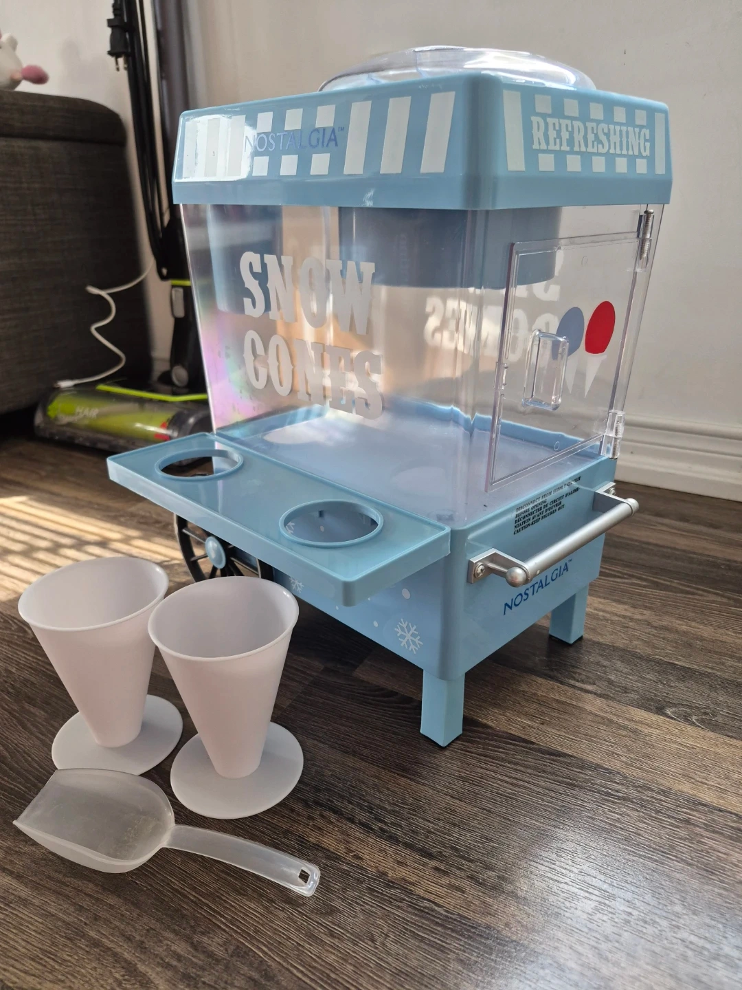 This Nostalgia snow cone maker is light blue and comes with two cups and a scoop. It has "Snow Cones" and "Refreshing" printed on it. Great for summer treats!