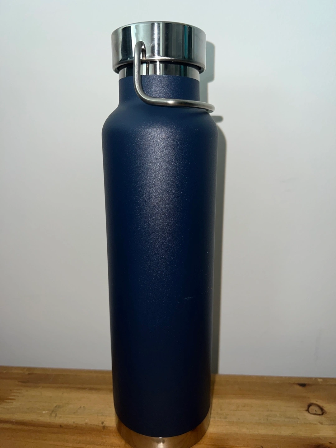 Brand new stainless steel water bottle in navy blue. It's light and keeps hot drinks hot and cold drinks cold for hours.