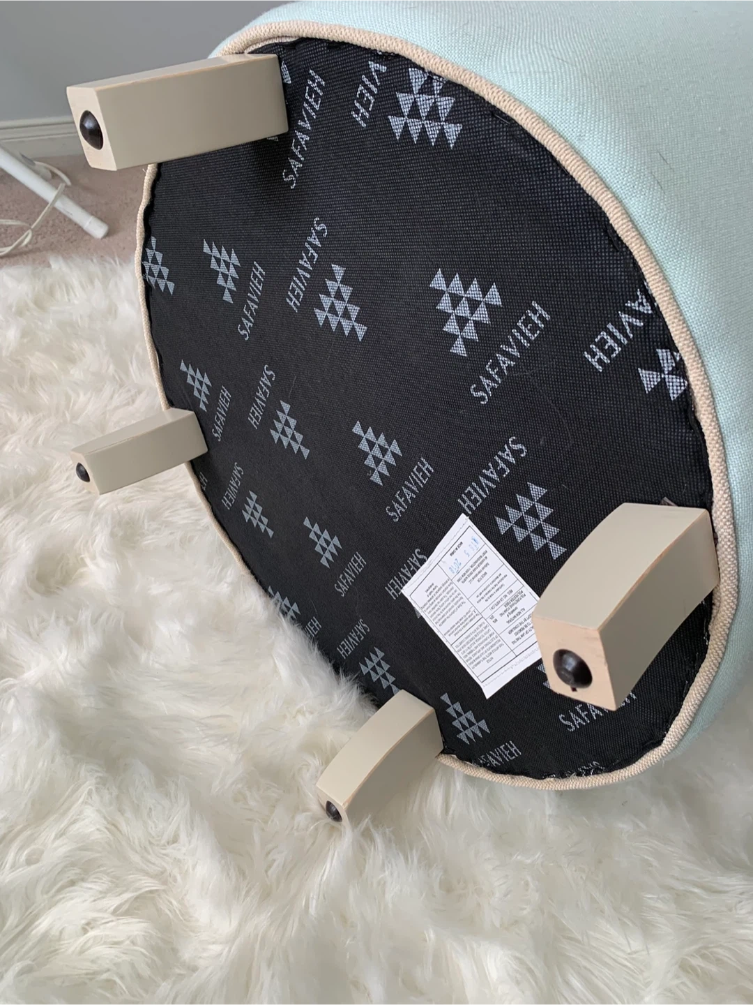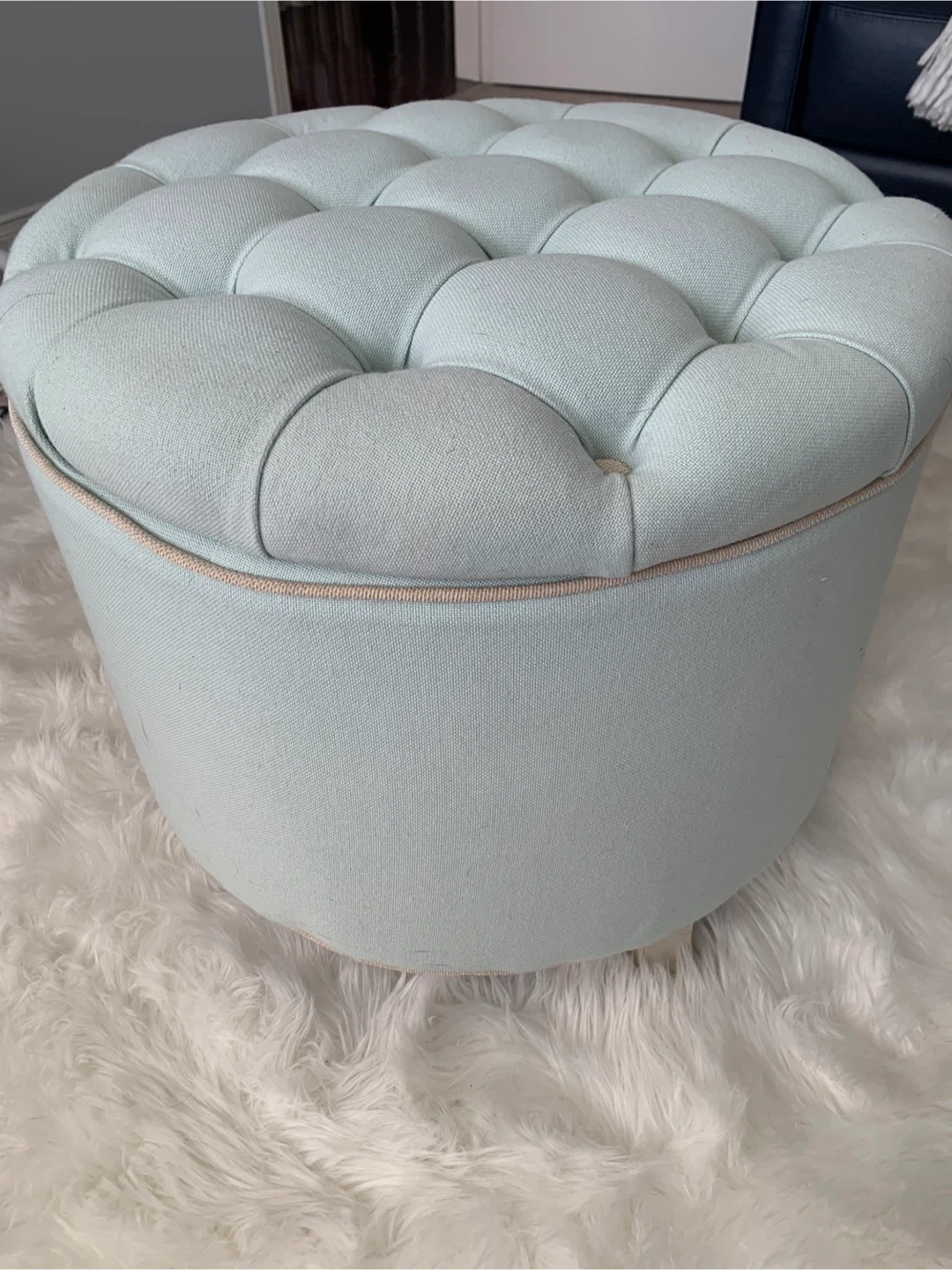 Mint Green upholstered ottoman with tufted top and storage inside. It has wooden legs and a fabric lining. This piece is great for adding extra seating or storage in any room! Nice and sturdy. 20 inches in diameter 18 inches tall. Pick up Georgetown South.