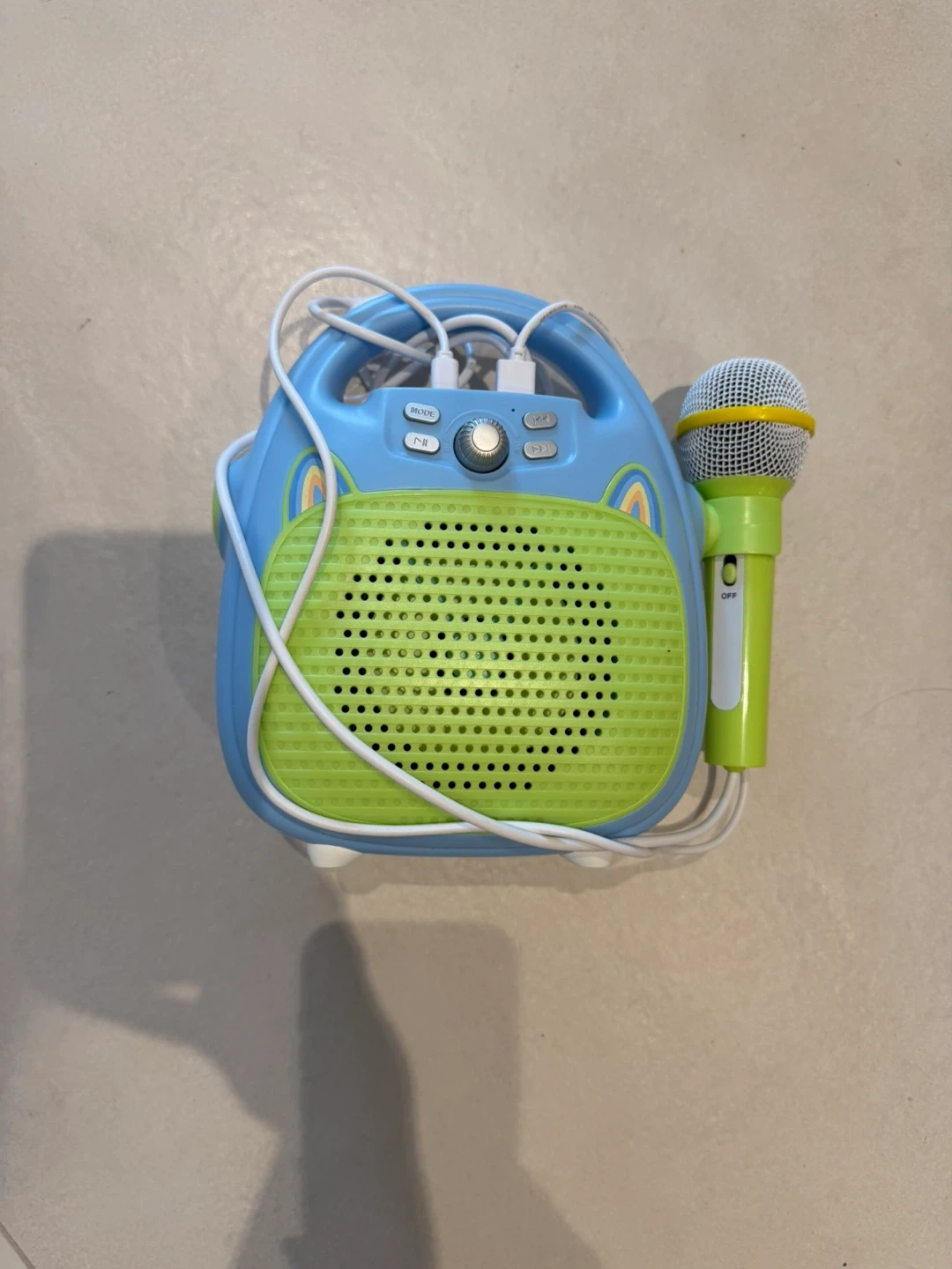 This is a blue and green kids' karaoke machine. It comes with a microphone and is ready for singing fun! It's great for young aspiring performers.