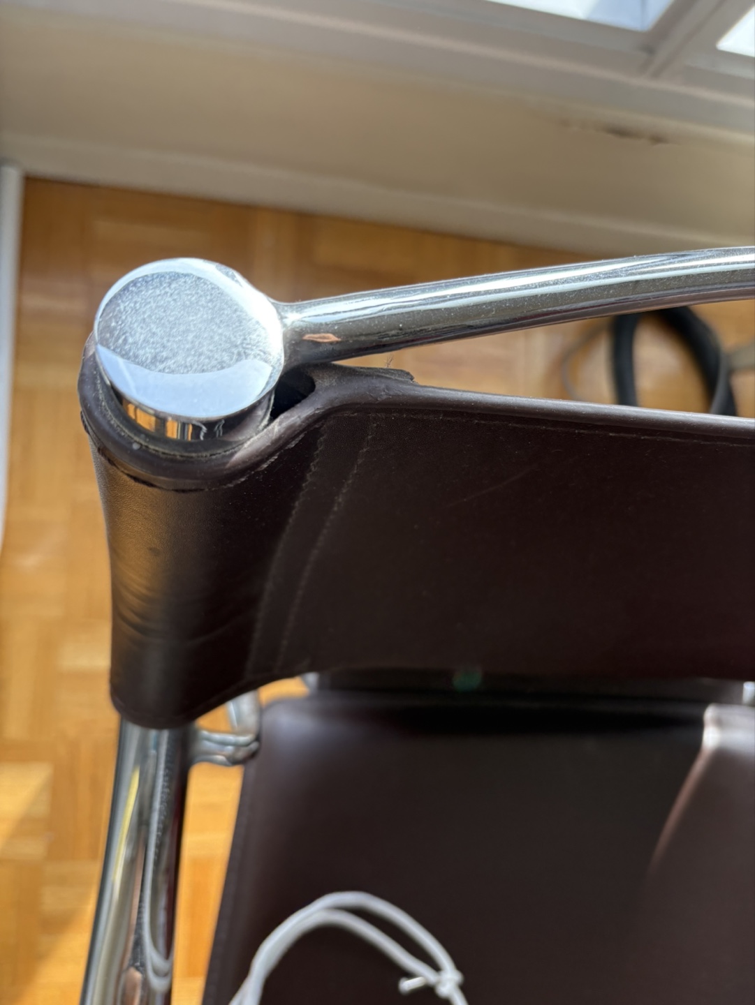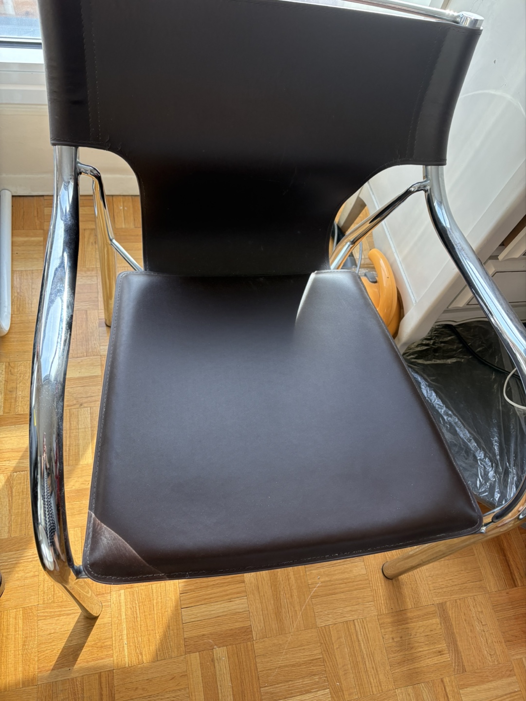 Large comfortable Sleek modern chair. Chrome frame, brown leather seat and back. Comfortable and stylish. Good for dining room or office.