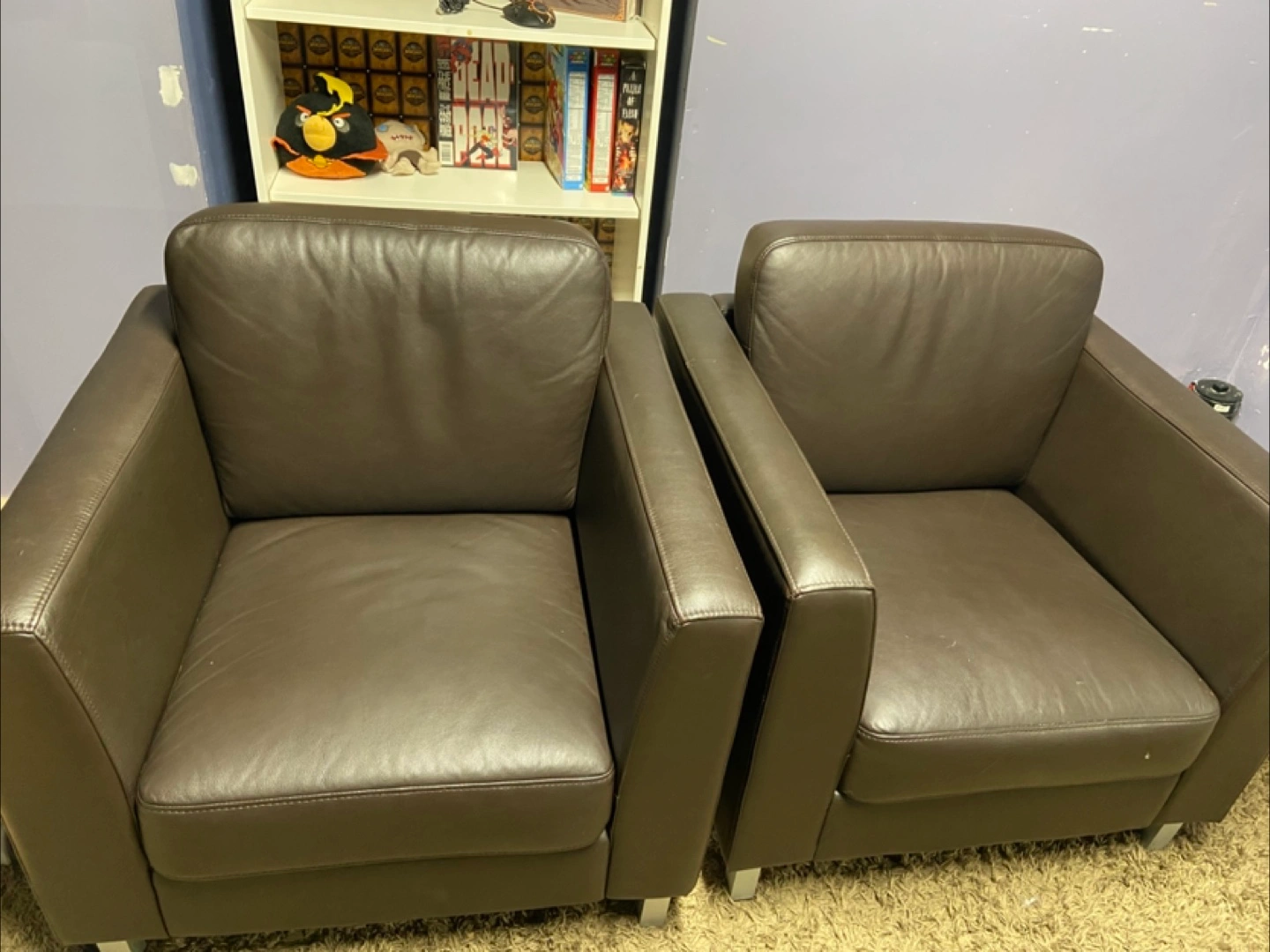 Two brown pleather armchairs. Darker in color than the photo shows .Modern style. Metal legs. Great condition , will need foot felt as some of the plastic bottoms have broken off ( doesn’t effect the chairs them self ) 375 for both located in Silverado - no delivery
