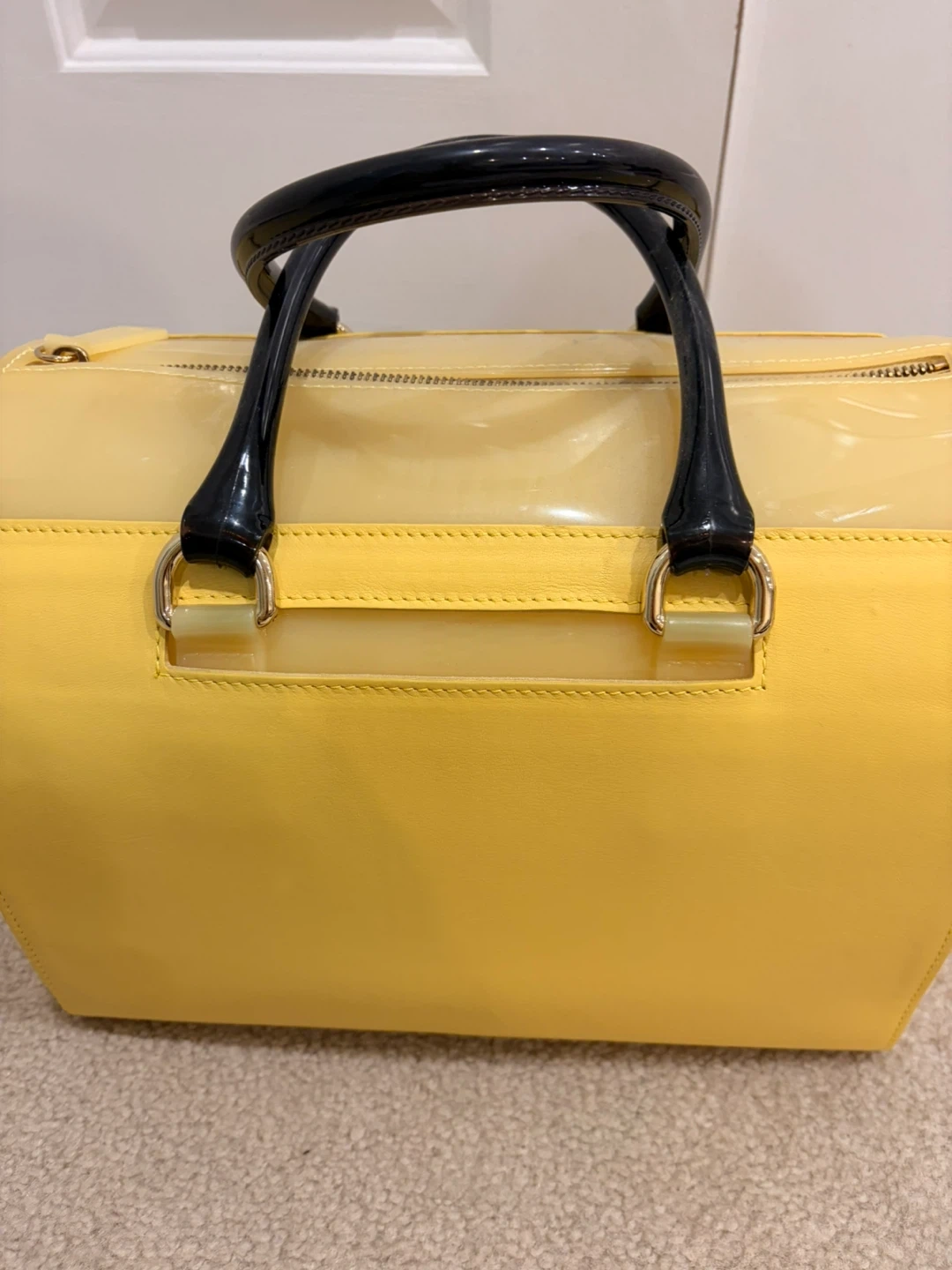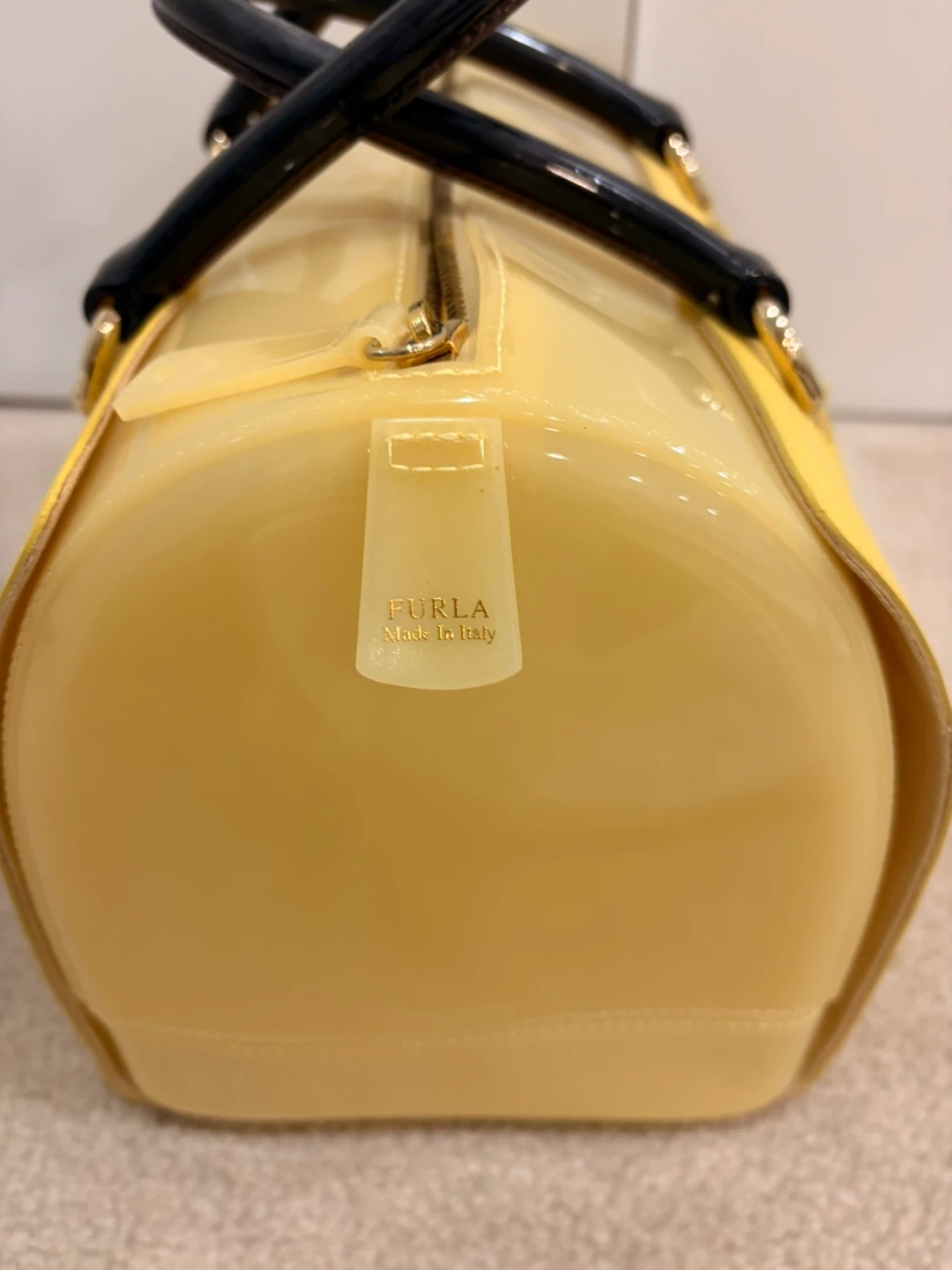 This is a Furla Candy satchel in yellow rubber and snakeskin-embossed leather