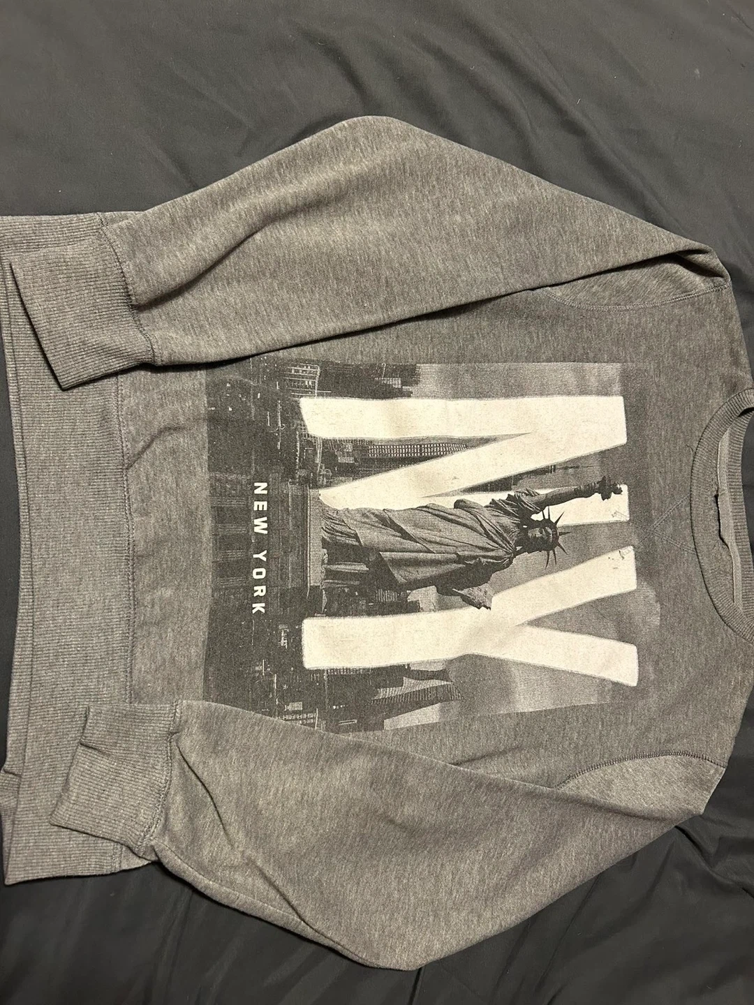 This grey crewneck sweatshirt features a "New York" graphic with the Statue of Liberty. It's made of a soft cotton blend, perfect for casual wear. The ribbed cuffs and hem provide a comfortable fit.
