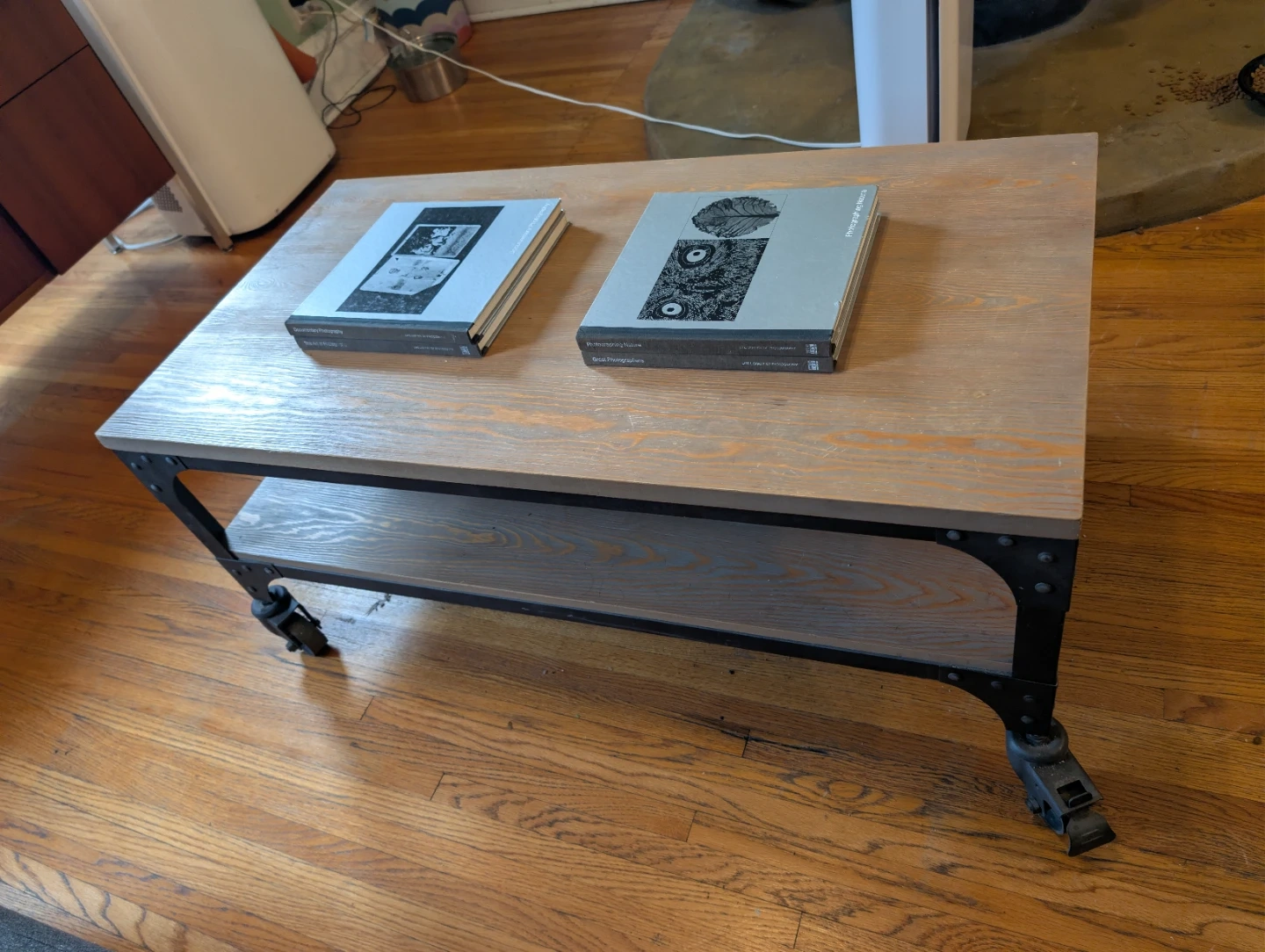 This is a sturdy coffee table with an industrial style design. It features a wooden top and a metal frame with wheels, making it easy to move around. It also has a lower shelf for storage or display