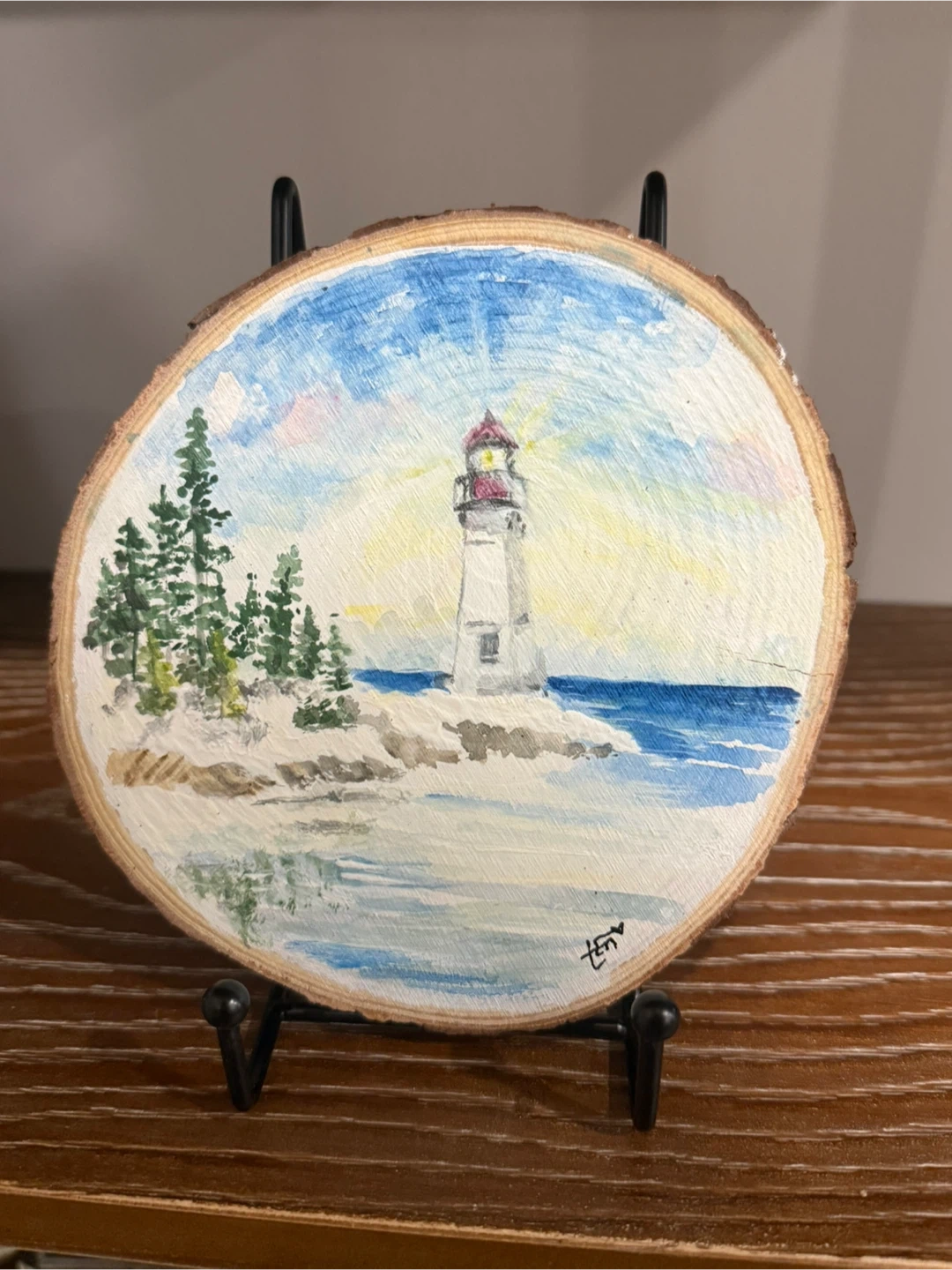 Hand-painted a watercolour art featuring a lighthouse on a natural wood slice approx. 6”. It depicts a coastal scene with trees and the ocean. The artwork is signed by the artist. This one of a kind painting is sealed with a matte varnish and comes with a display stand. This unique piece of art would be a charming addition to home decor.