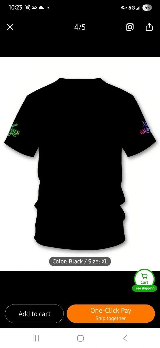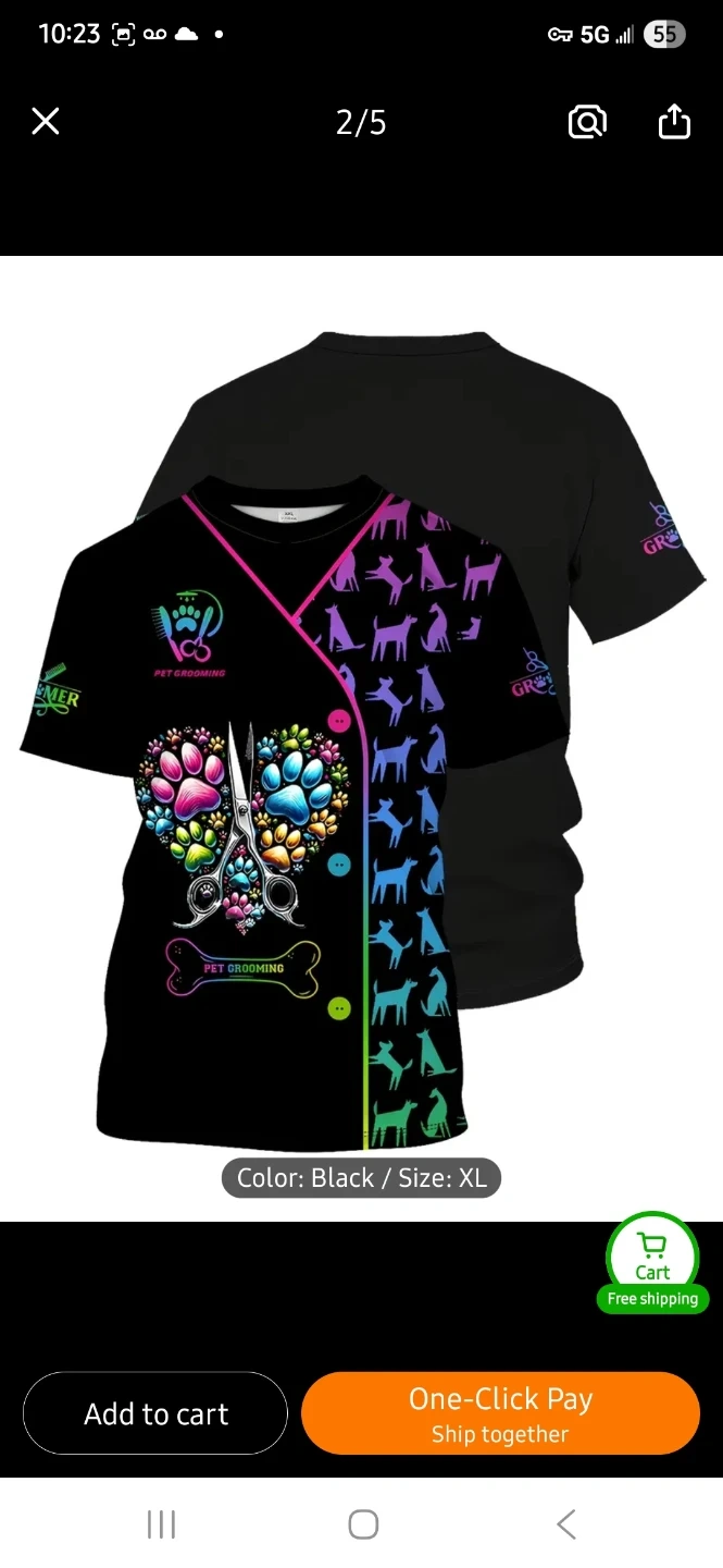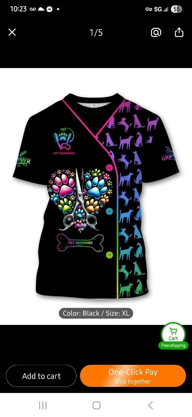 This t-shirt features a colourful paw print and scissor graphic with 'Pet Grooming' text. It's made of a comfortable material and comes in black. It has a button closure.