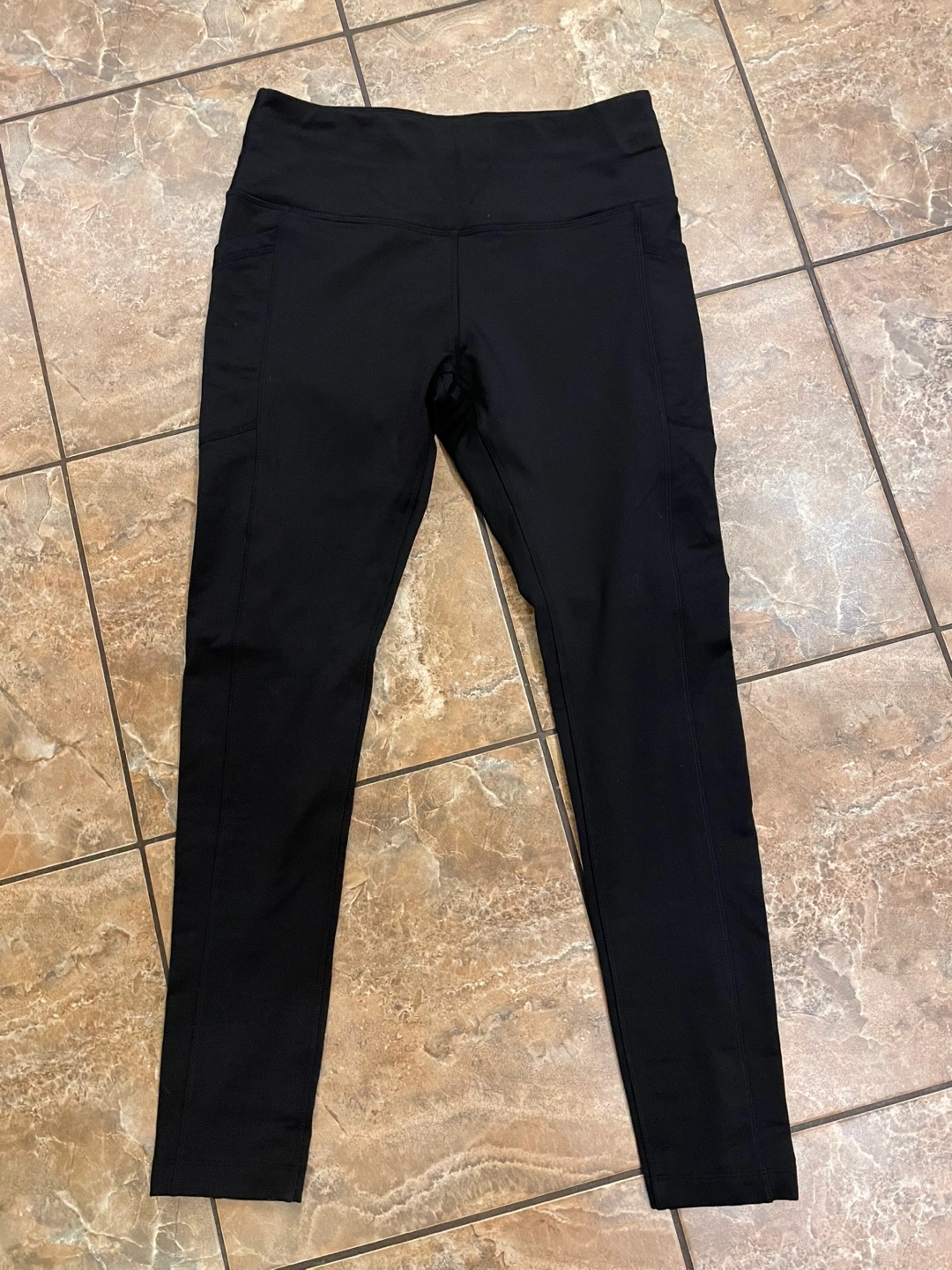 Women's Mondetta fleece lined black athletic leggings. High-waisted with pockets, and drawstring waist.