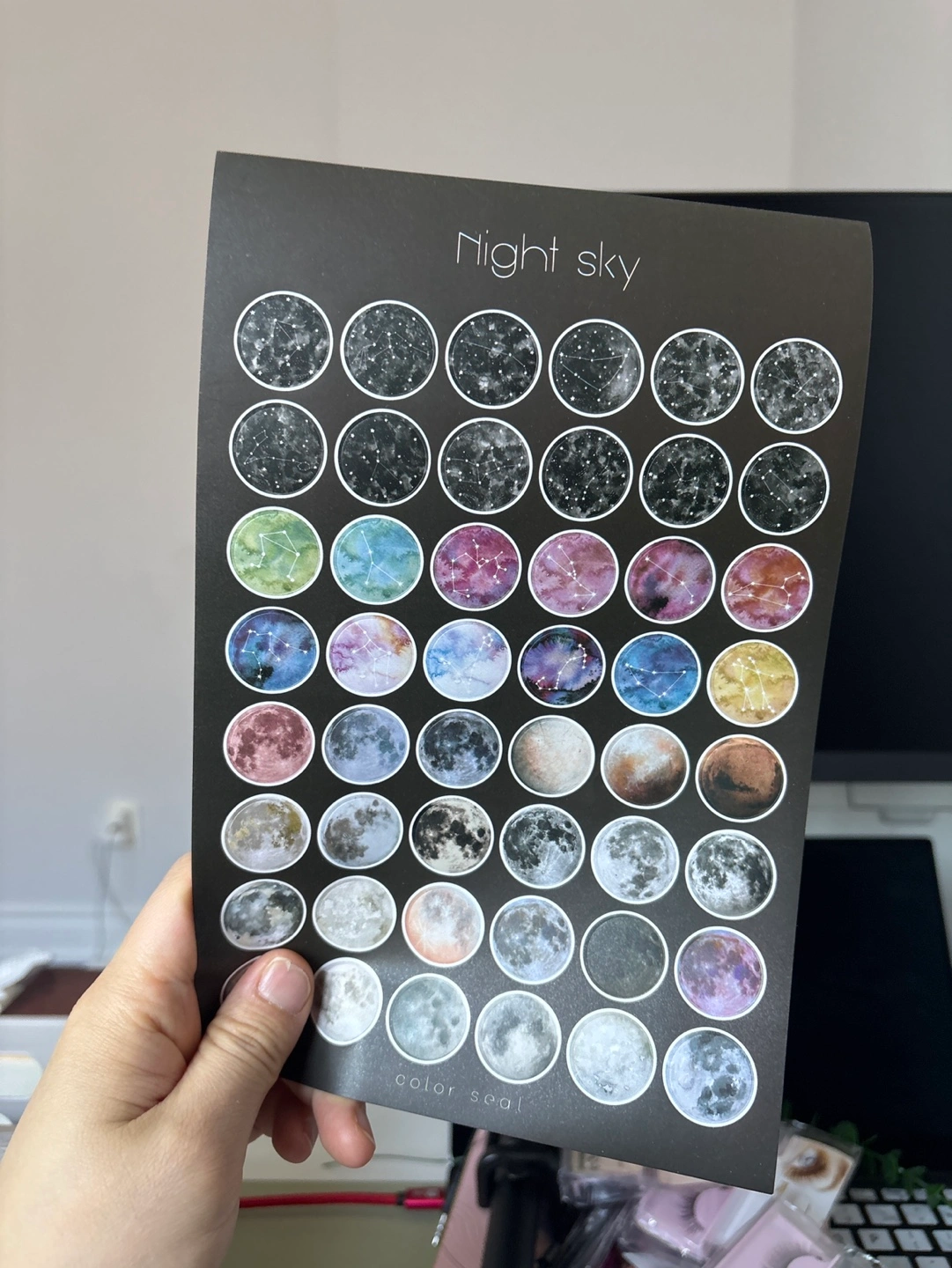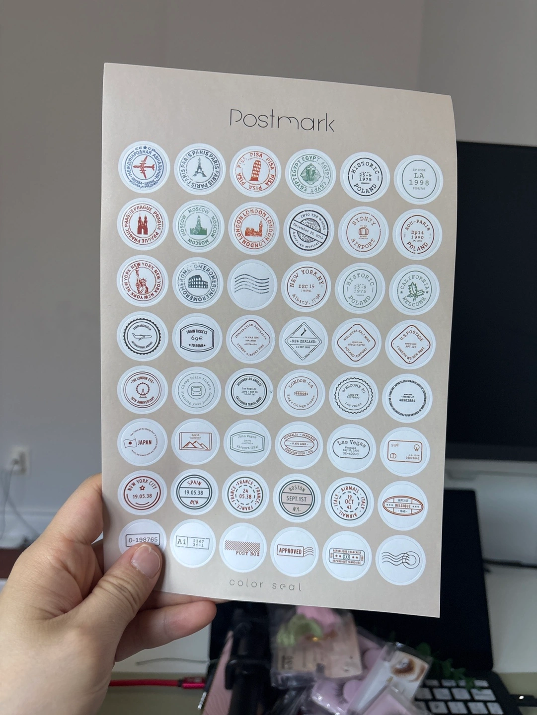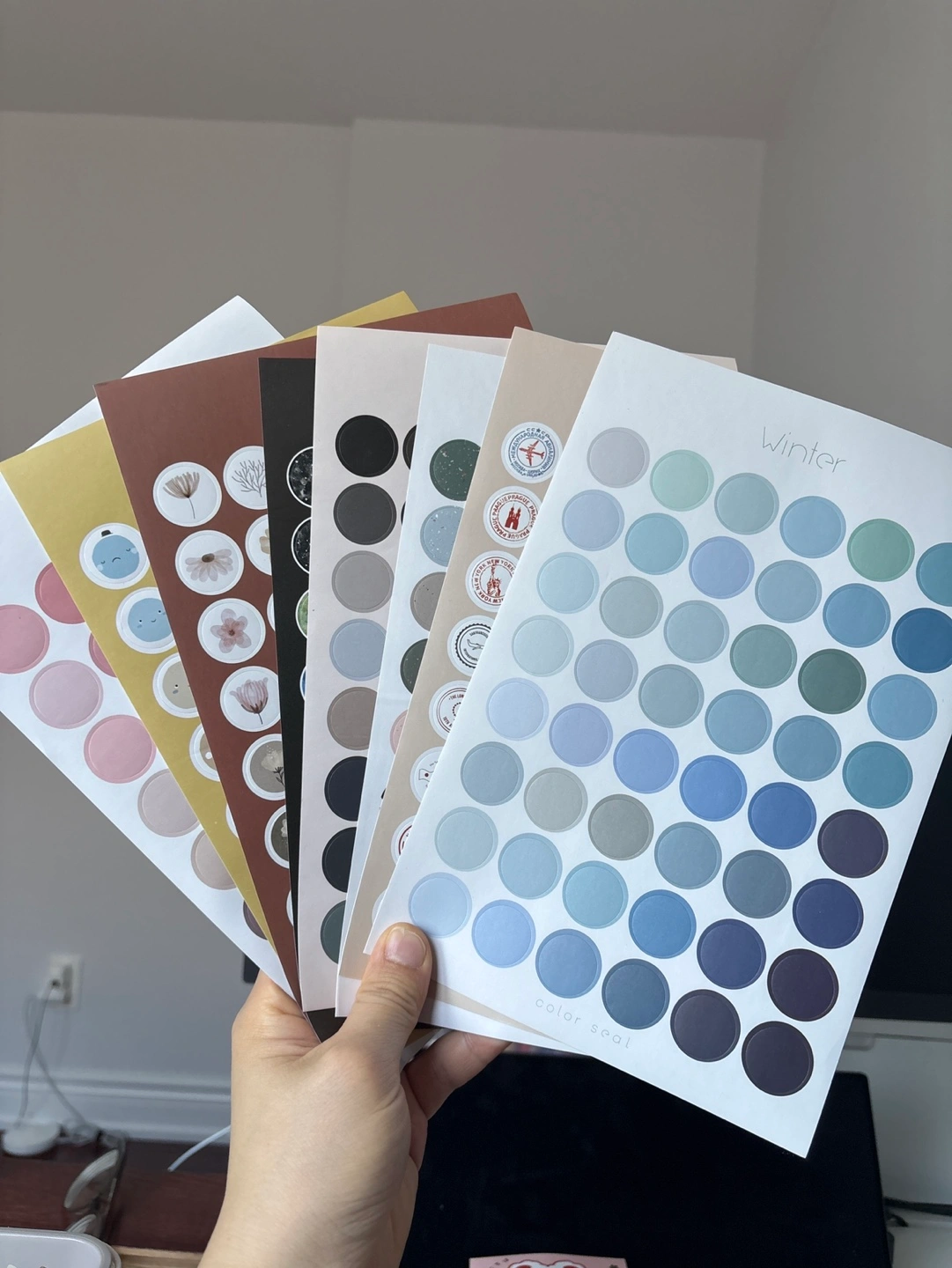 Set of decorative sticker sheets. Multiple designs available: Postmark, Winter, Vintage Colour, Marble, and others. Each sheet features numerous round stickers. Ideal for journaling, scrapbooking, or other crafting projects.