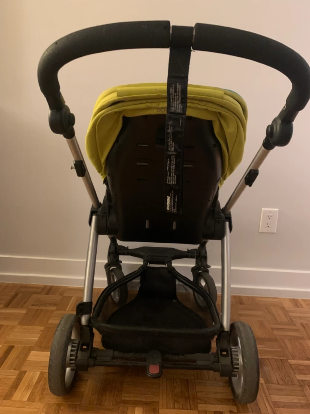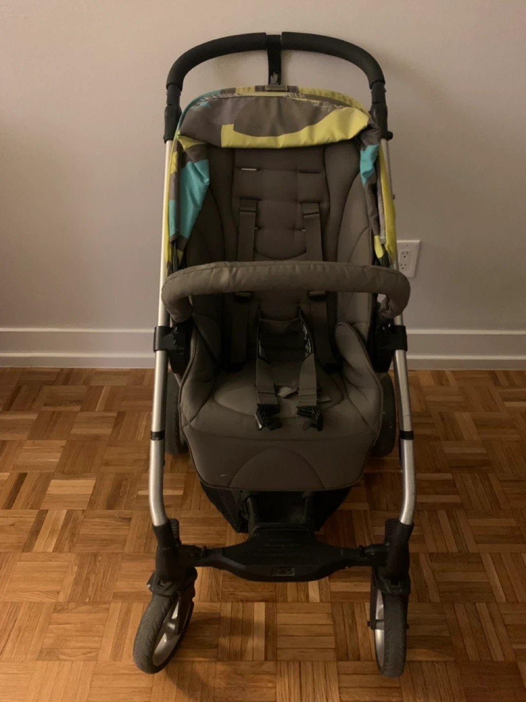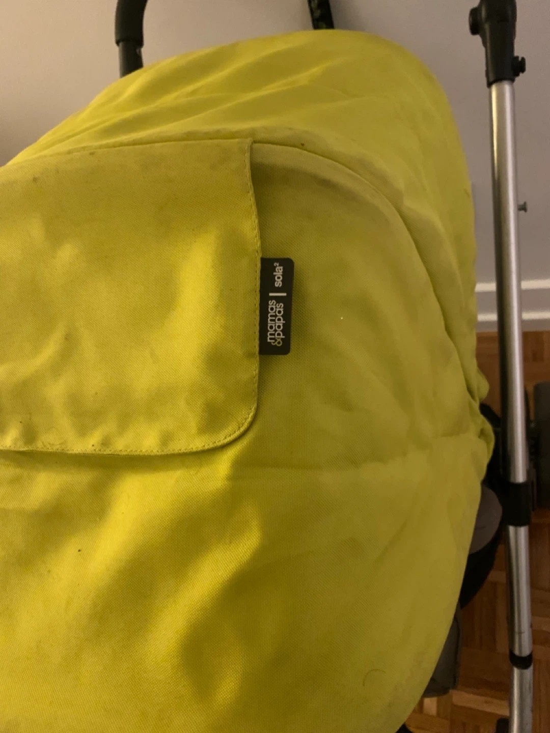 A Mamas & Papas Sola stroller in grey and lime green. It features a five-point harness and a removable bumper bar. This stroller is suitable for use from 1 year. It needs new belt