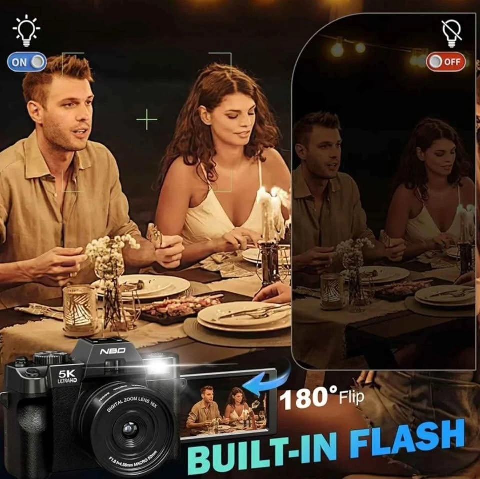 Versatile NBD 5K UltraHD digital camera. Has a 180° flip screen perfect for vlogging. Built-in flash for low light. Comes with a super wide angle lens and a macro lens for different shots. Includes two batteries, charger, USB cables, and a 64GB memory card. Everything you need to start shooting!