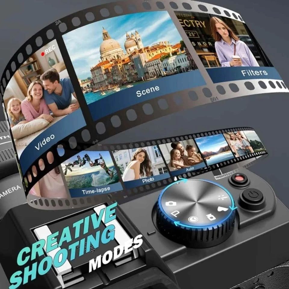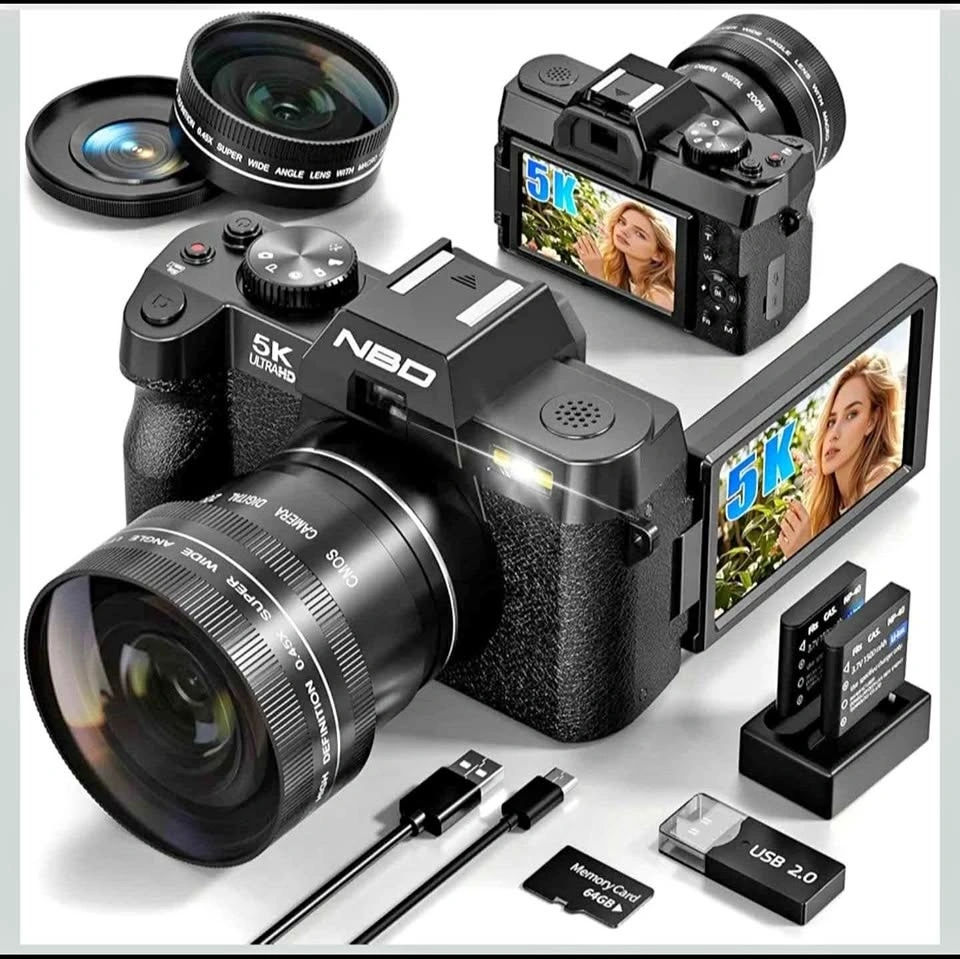 Versatile NBD 5K UltraHD digital camera. Has a 180° flip screen perfect for vlogging. Built-in flash for low light. Comes with a super wide angle lens and a macro lens for different shots. Includes two batteries, charger, USB cables, and a 64GB memory card. Everything you need to start shooting!