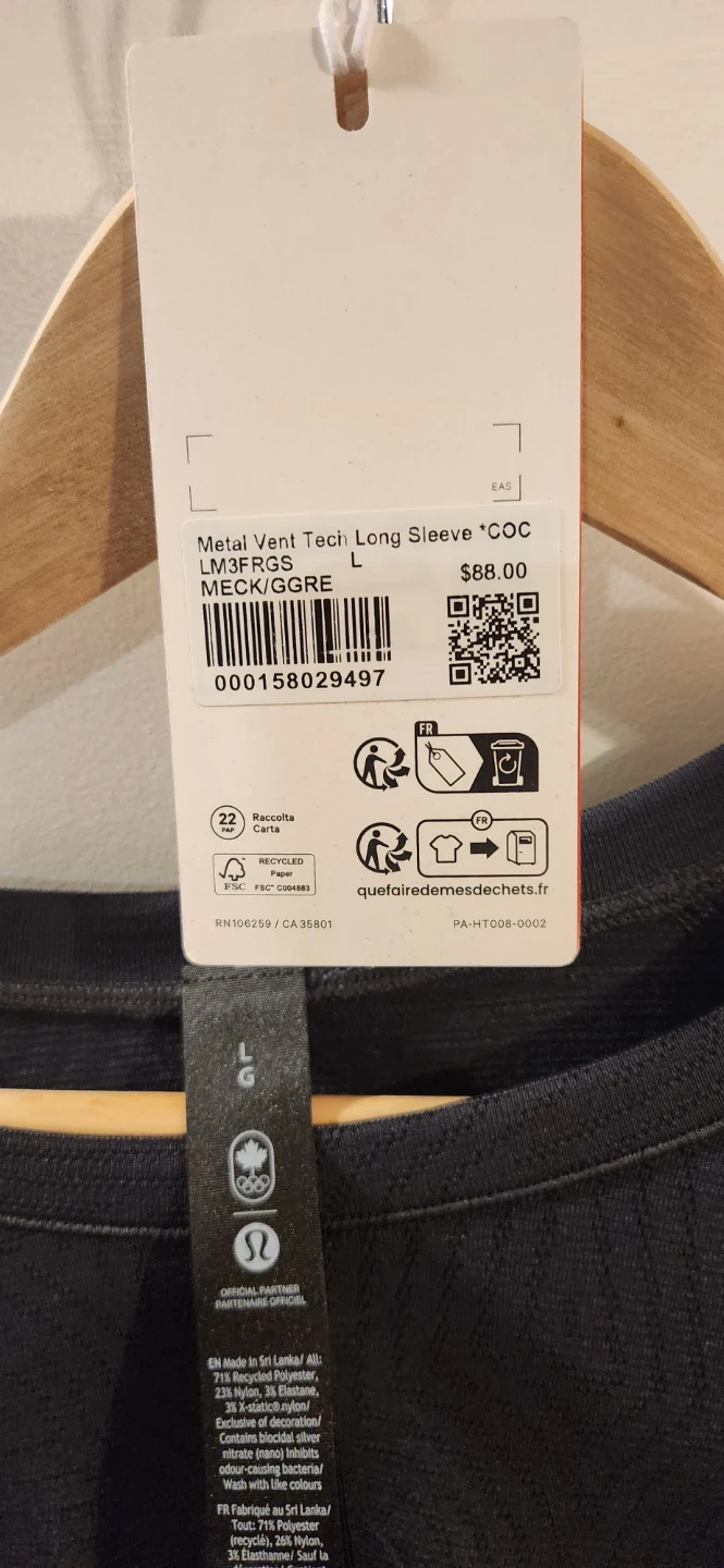 Brand new Lululemon in Black Metal Vent Tech long sleeve shirt in Large . Made in Sri Lanka. Contains 71% polyester, 19% nylon, and 10% X-static nylon. It's designed with anti-odour fabric. I have this in many sizes starting from small going up to XXL. I'm asking 40 dollars each or 2 for 75.