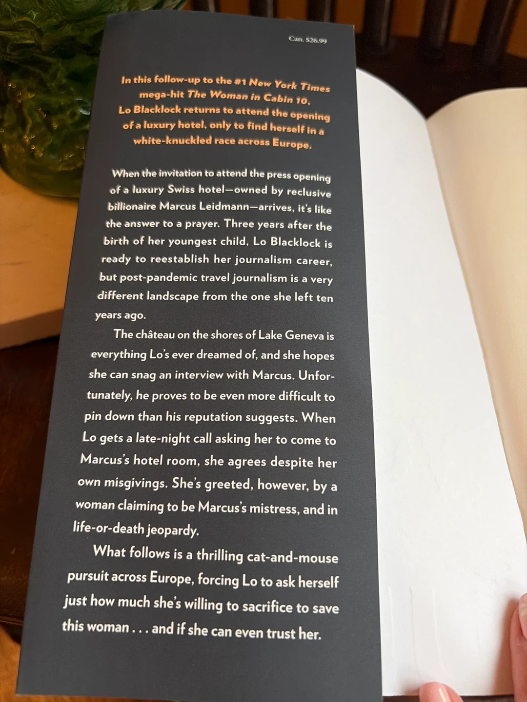 This novel by Ruth Ware is a follow-up to The Woman in Cabin 10. It's a mystery involving a luxury hotel and a pursuit across Europe. It is in excellent condition with no rips or tears. The book measures approximately 9.75 inches tall and 6.5 inches wide. If you’ve read the first novel, here’s your chance to grab the sequel at an amazing price!