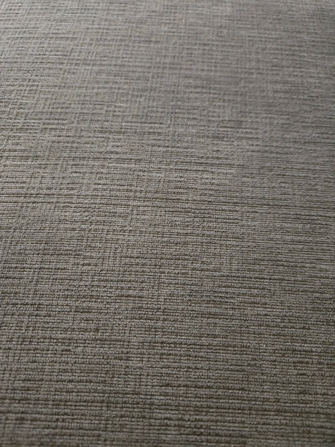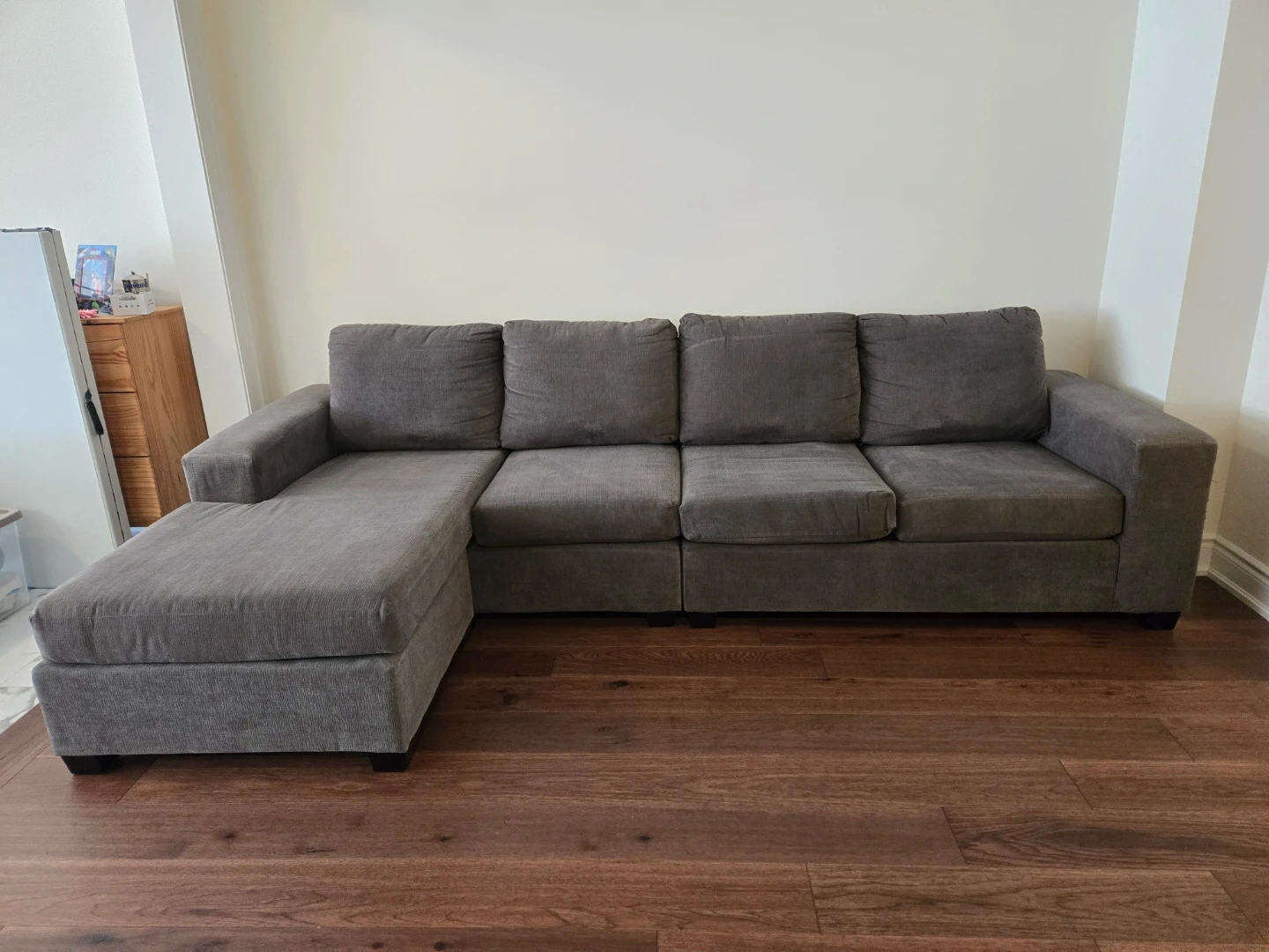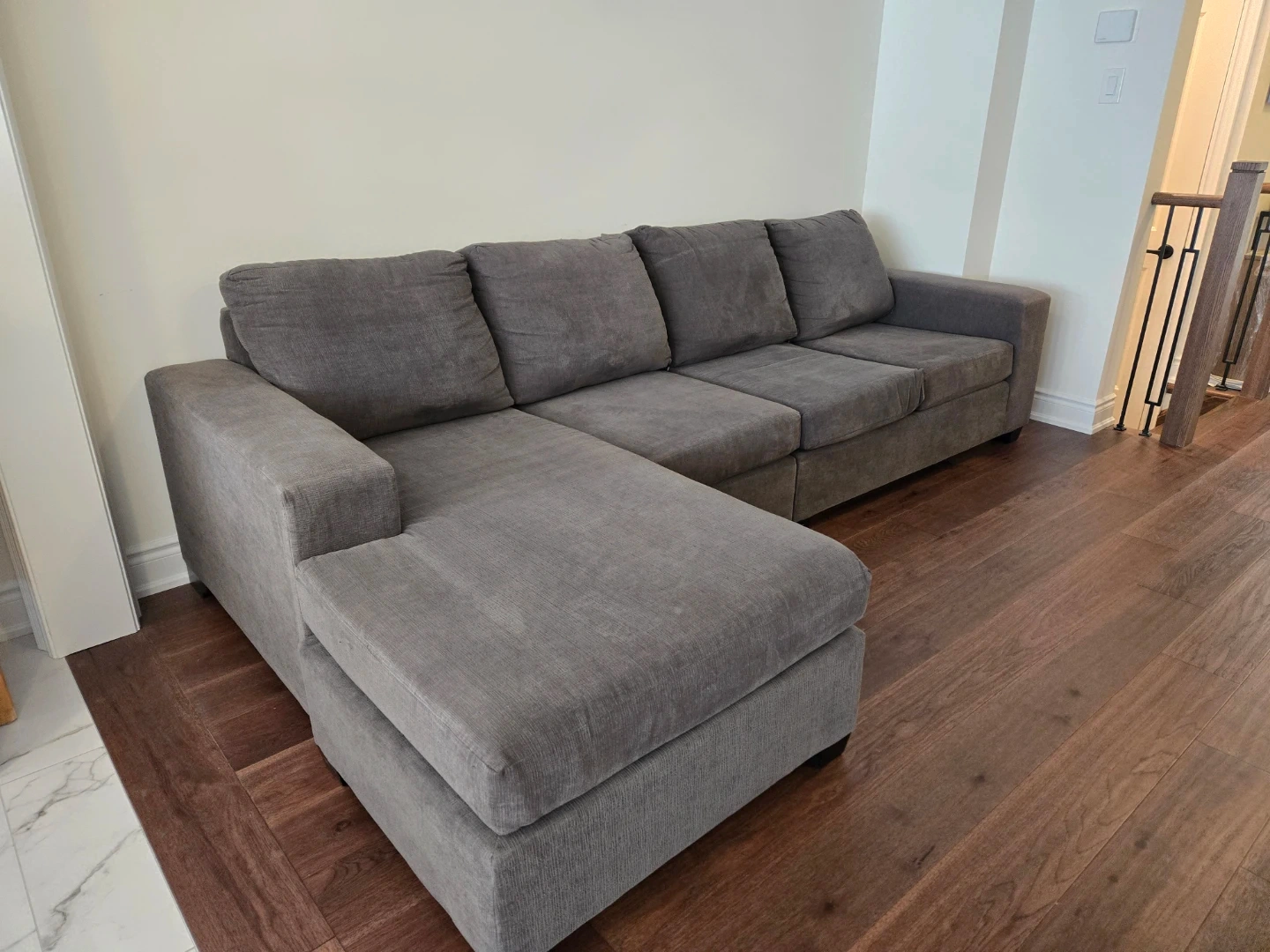 Grey sectional sofa with chaise. The fabric is thick and durable, and feels nice to the touch. Thick, supportive cushions. Very comfortable.