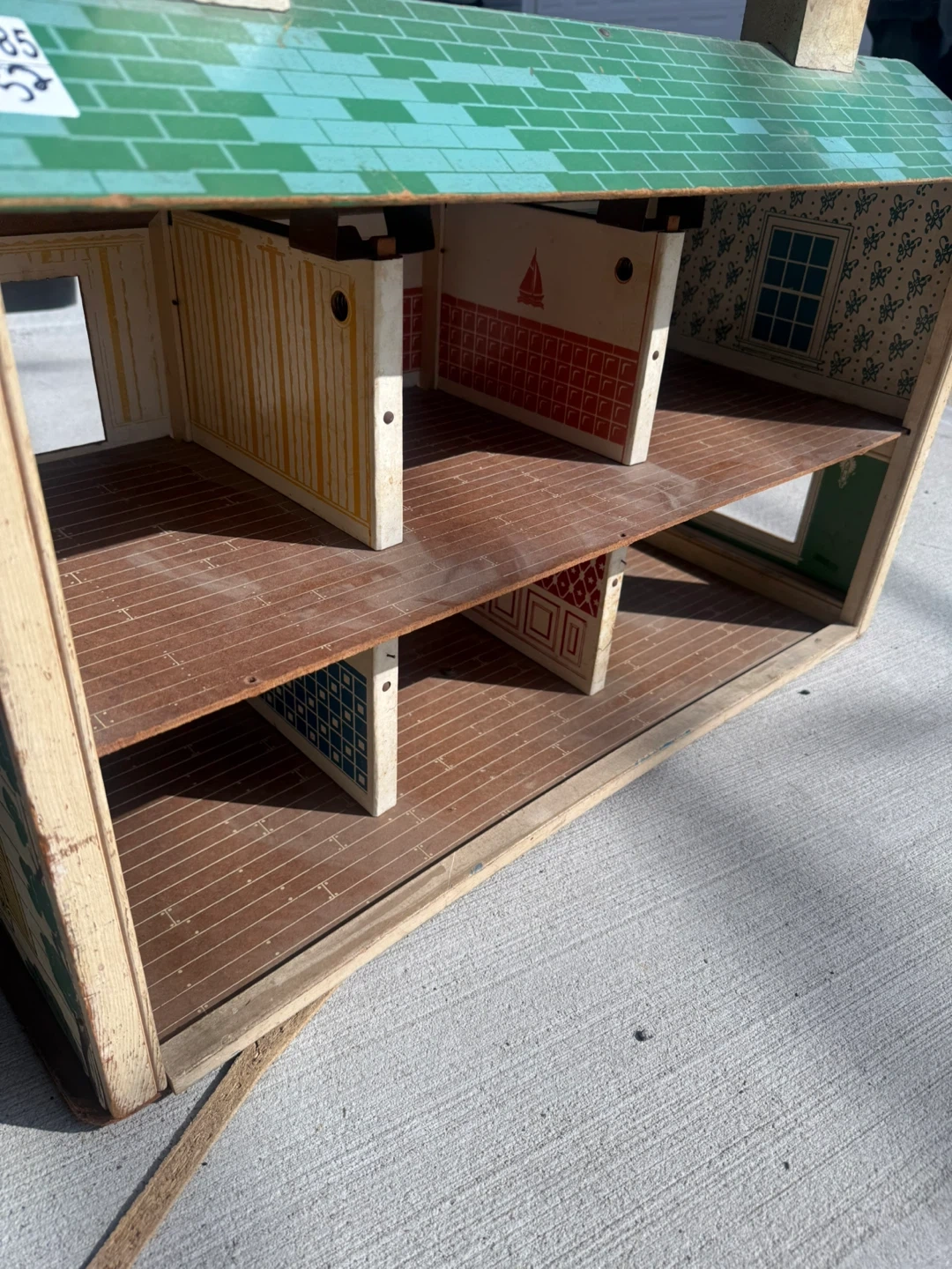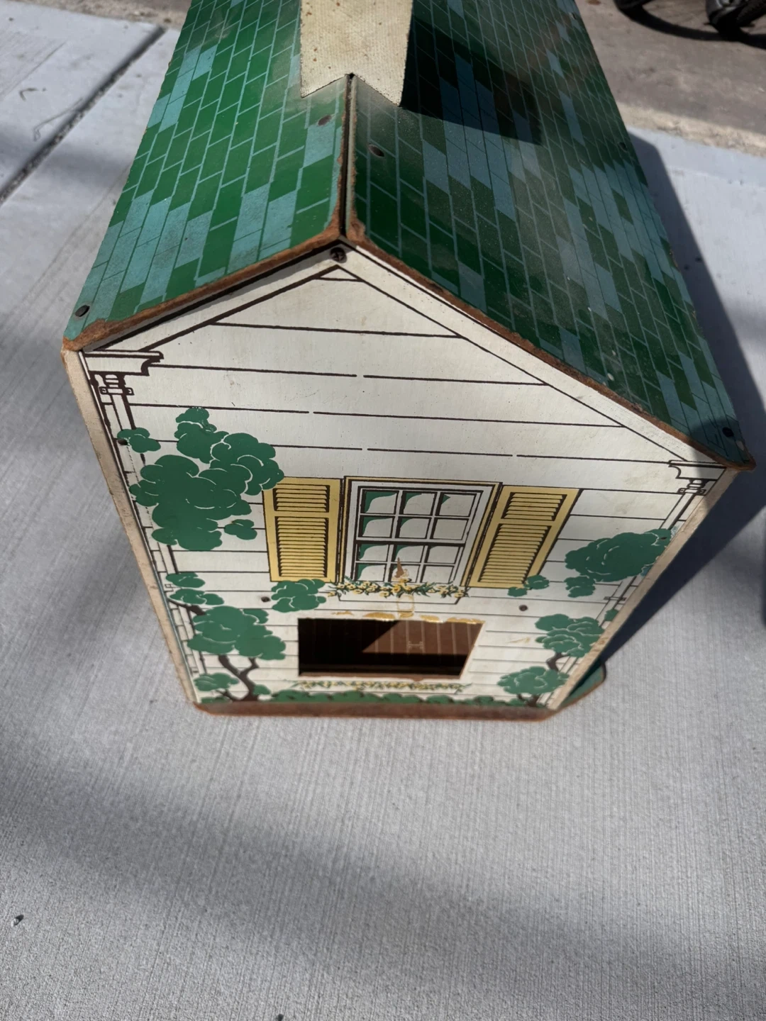 This is a vintage dollhouse with a green shingled roof and a white exterior. It features yellow shutters and decorative trees. It's a classic toy for imaginative play!