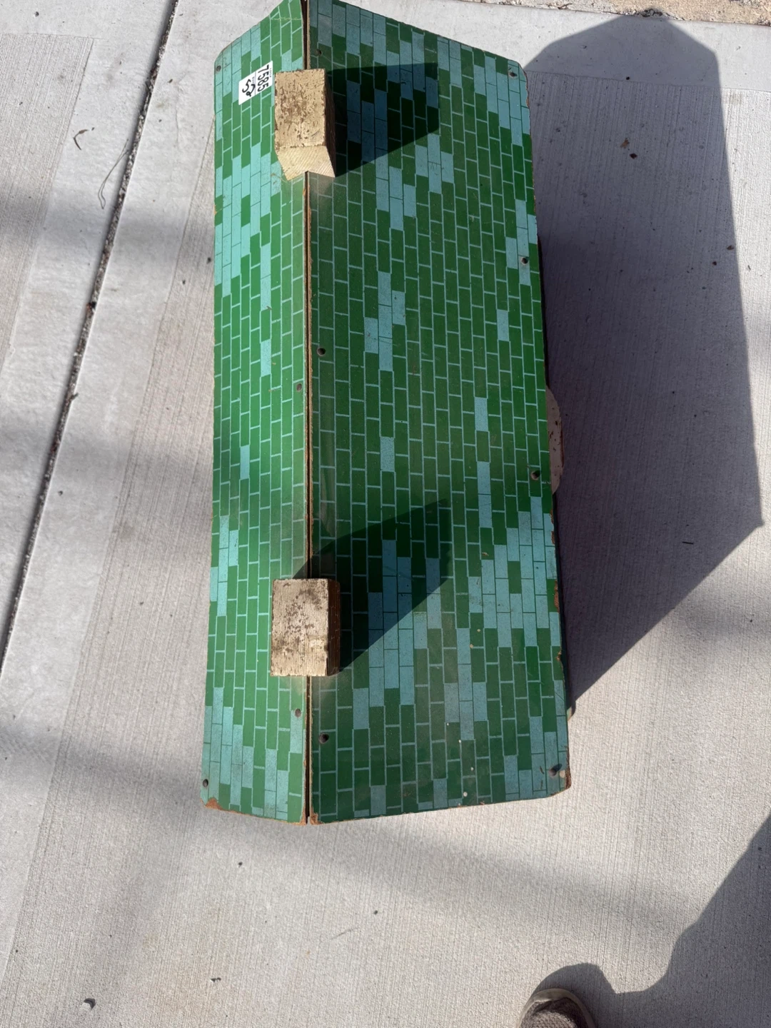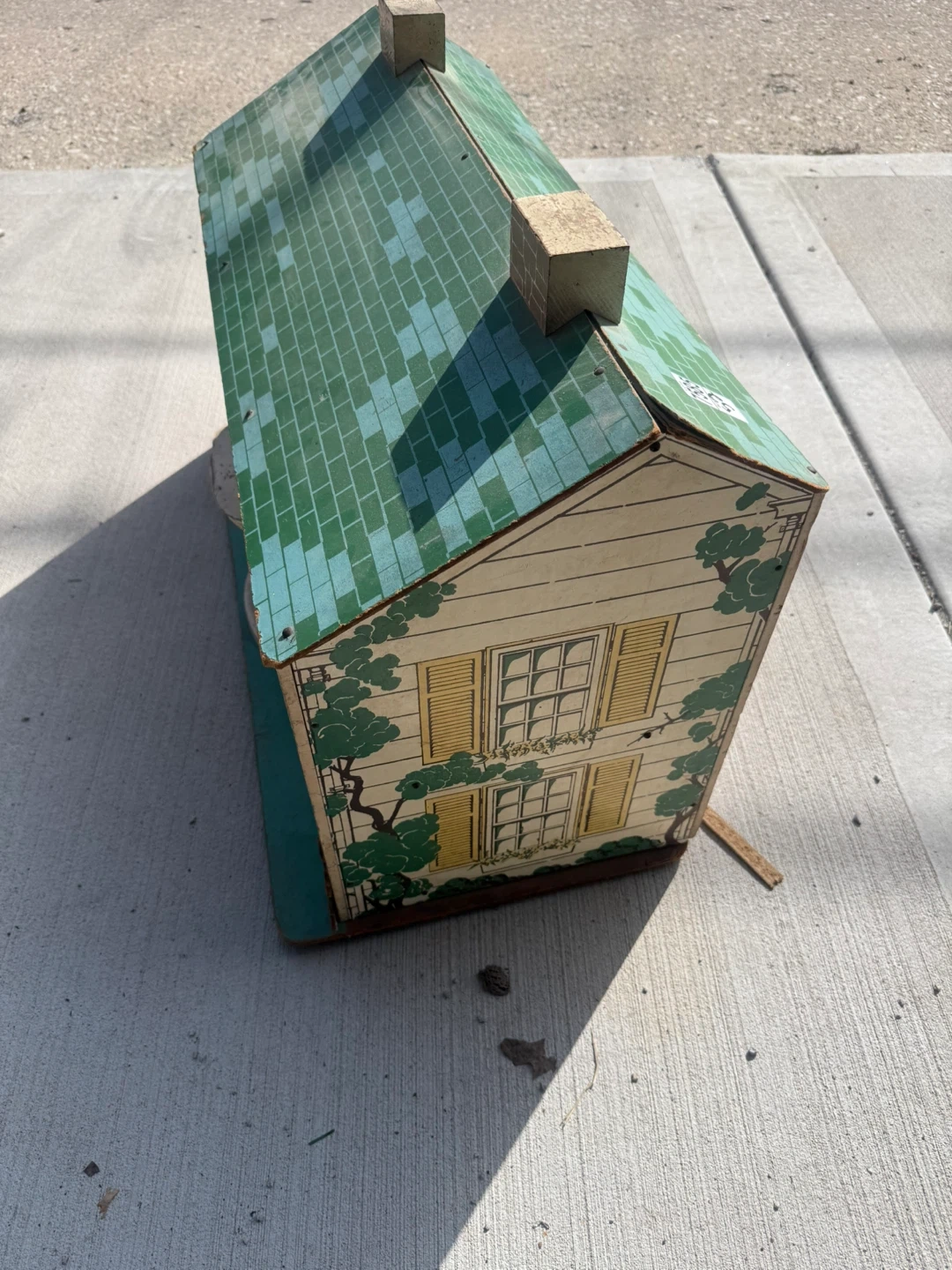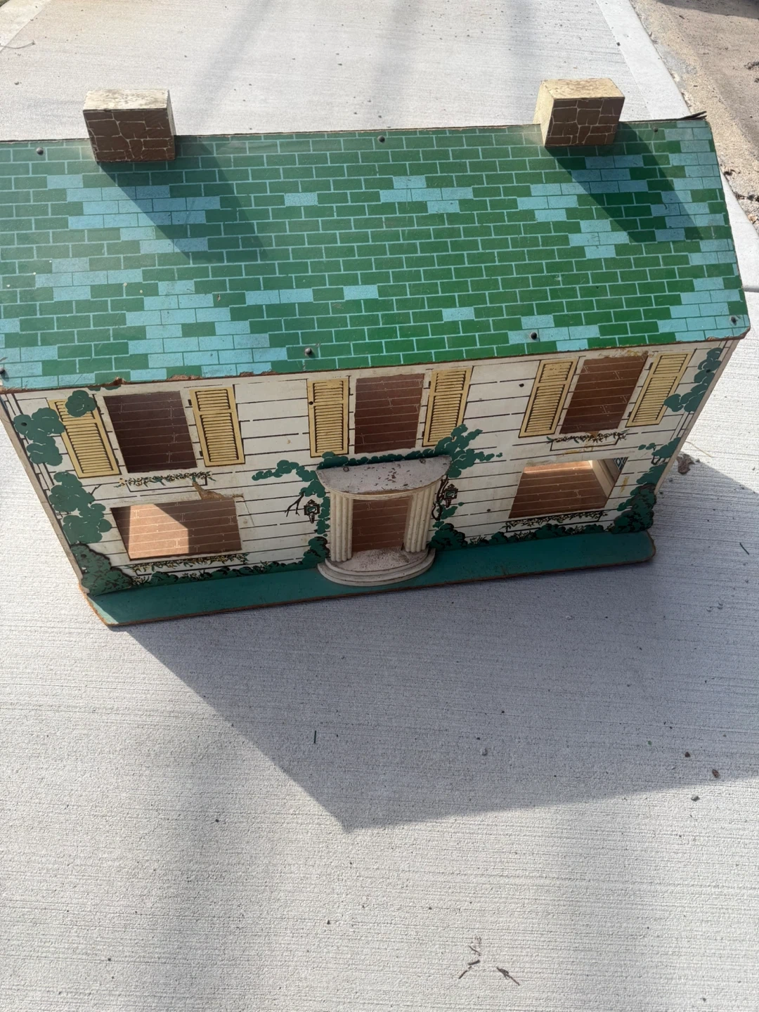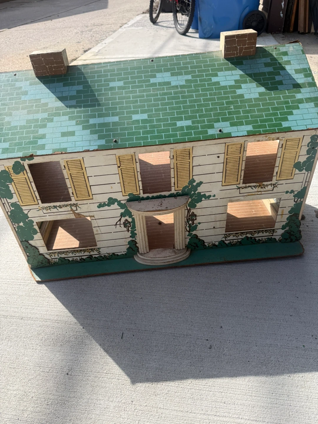 This is a vintage dollhouse with a green shingled roof and a white exterior. It features yellow shutters and decorative trees. It's a classic toy for imaginative play!