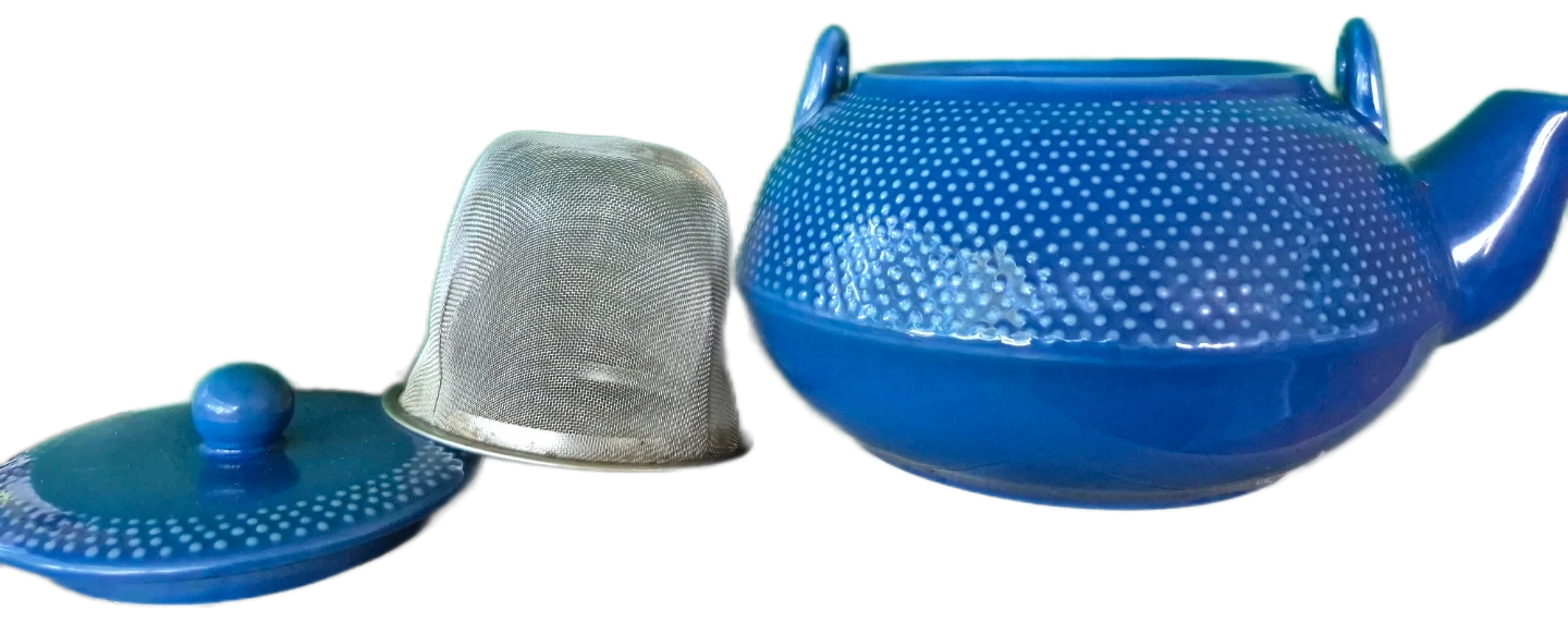 This vibrant blue teapot features a charming dotted pattern. It includes a removable mesh infuser for loose leaf tea and a matching lid. Ceramic material.