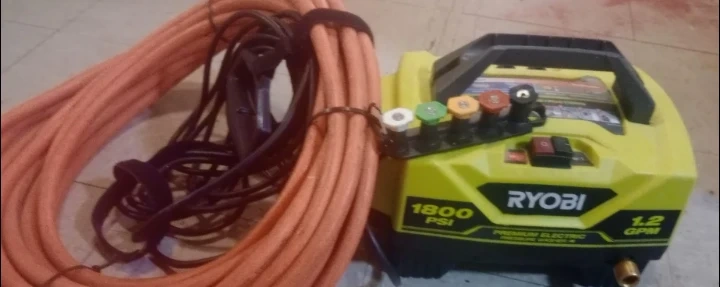 This is a Ryobi 1800 PSI electric pressure washer. It offers 1.2 GPM and comes with multiple spray nozzles. It's great for general cleaning tasks around the house!