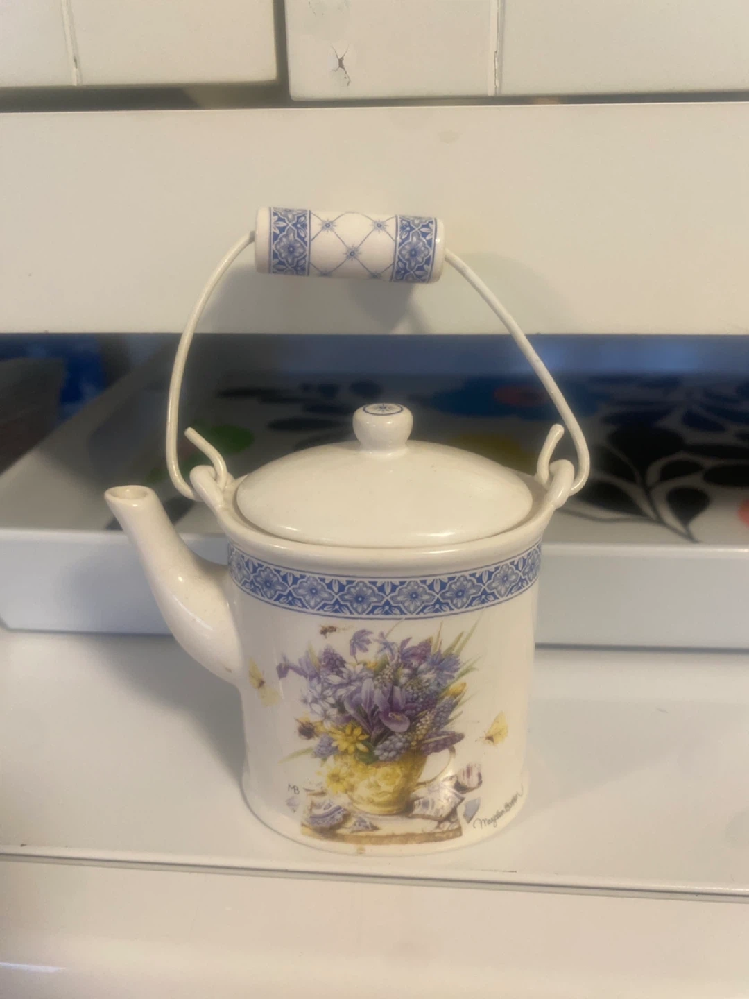 This decorative ceramic watering can features a lovely floral and bee design with a blue and white border. It has a hinged lid and a metal handle with a decorative ceramic grip. It's a charming piece for display!