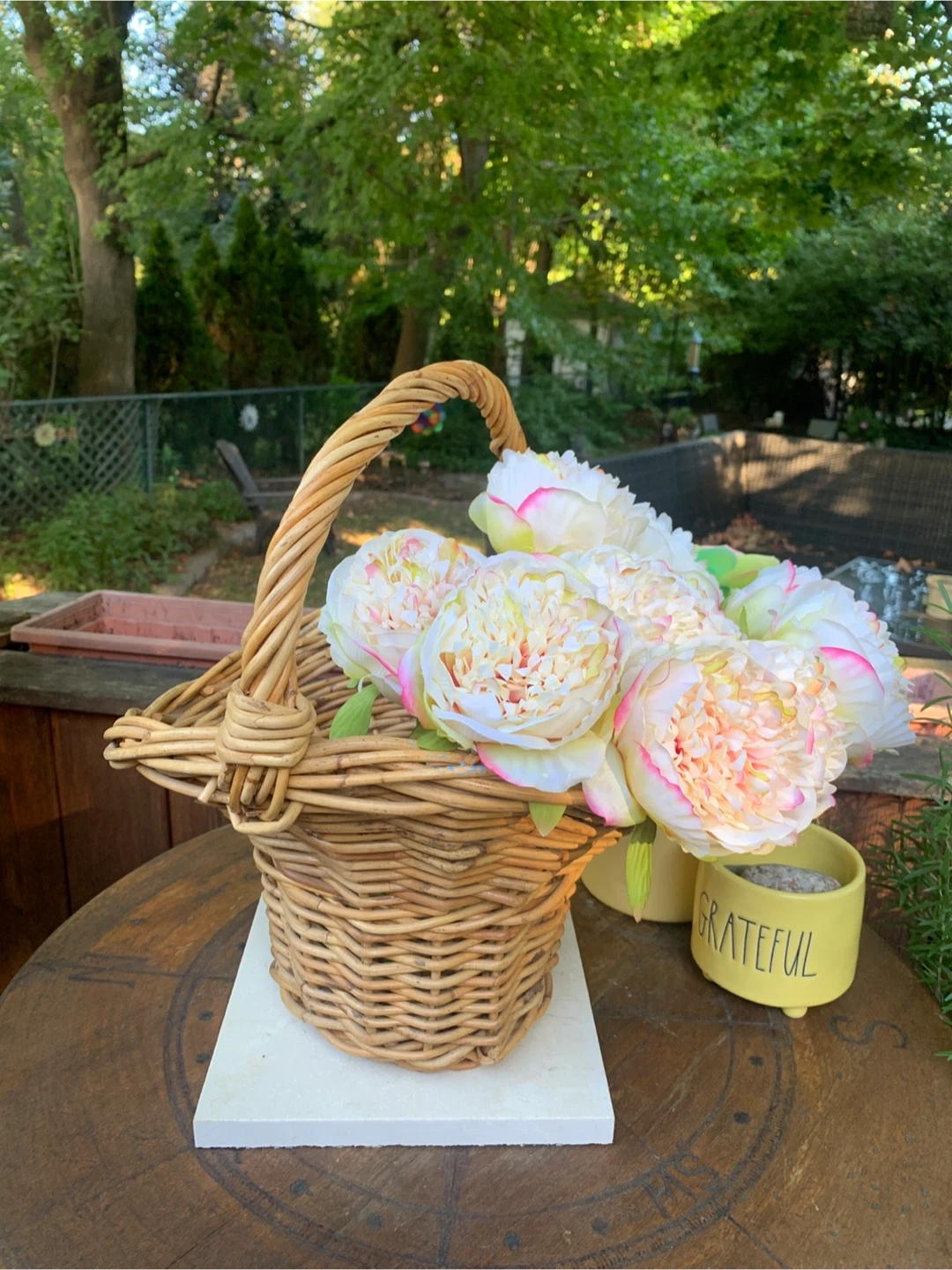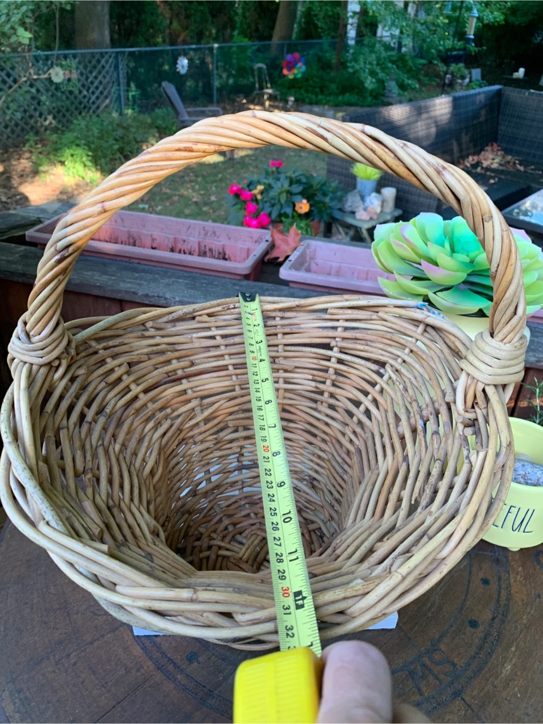 Selling an unusual shaped wicker basket with a handle, perfect for decor or storage. It would look lovely as a floral centrepiece with fresh flowers or dried florals. Makes a great base for a holiday gift!