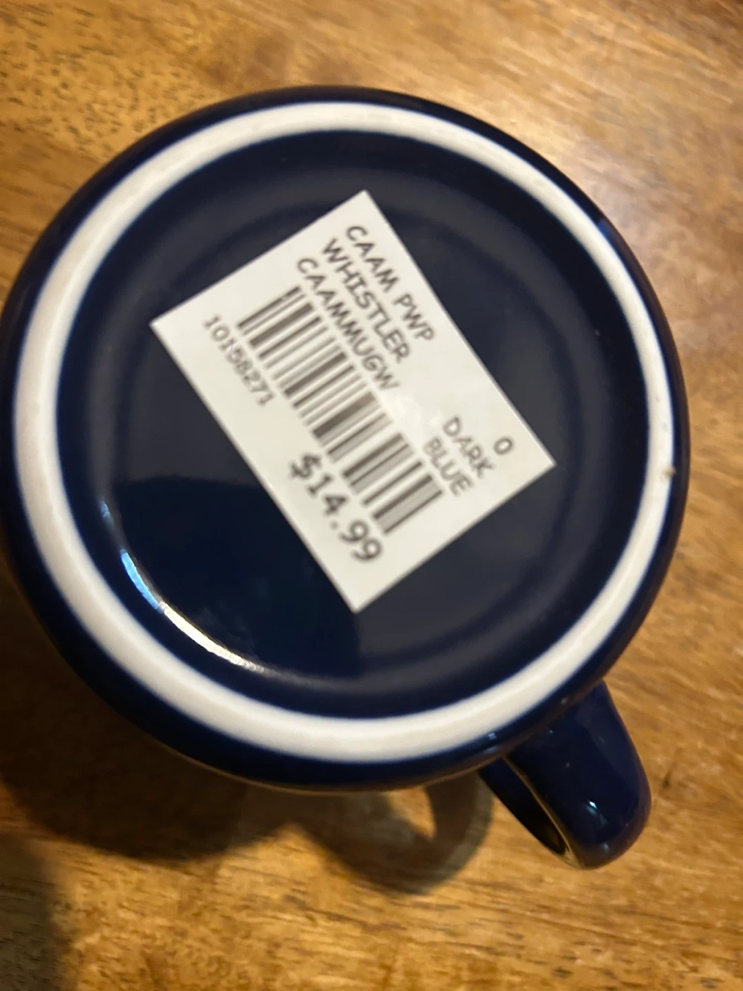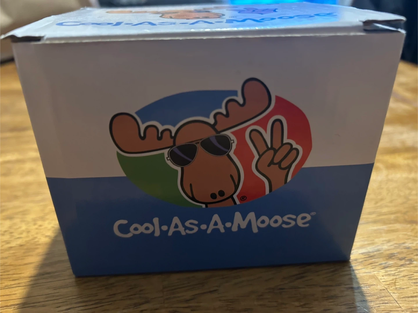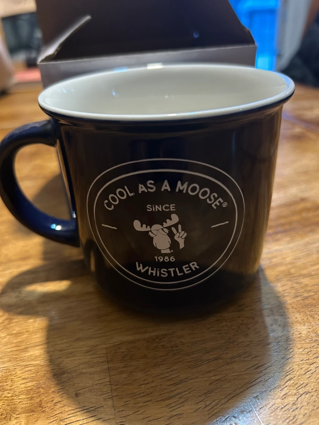 This dark blue ceramic mug features the 'Cool As A Moose' logo and 'Whistler' text. It's in its original box. Ceramic material. Comes with the box.