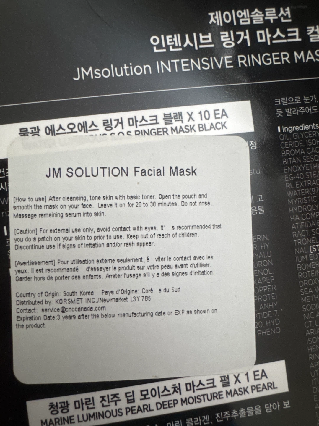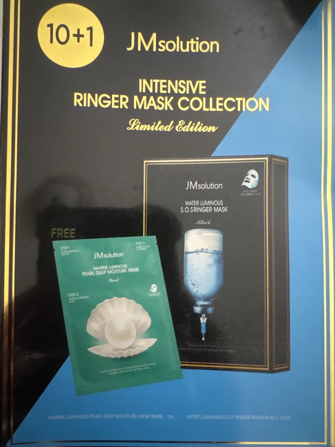 This is a JM Solution Intensive Ringer Mask Collection with a 10+1 offer. Includes Marine Luminous Pearl Deep Moisture Mask and Water Luminous S.O.S Ringer Mask. These masks are designed for intense hydration and skin revitalization.