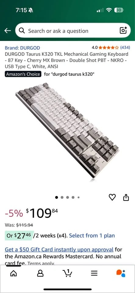 New, open box, DURGOD Taurus K320 TKL Mechanical Gaming Keyboard - 87 Key - Cherry MX Brown - Double Shot PBT - NKRO - USB Type C, White, ANSI