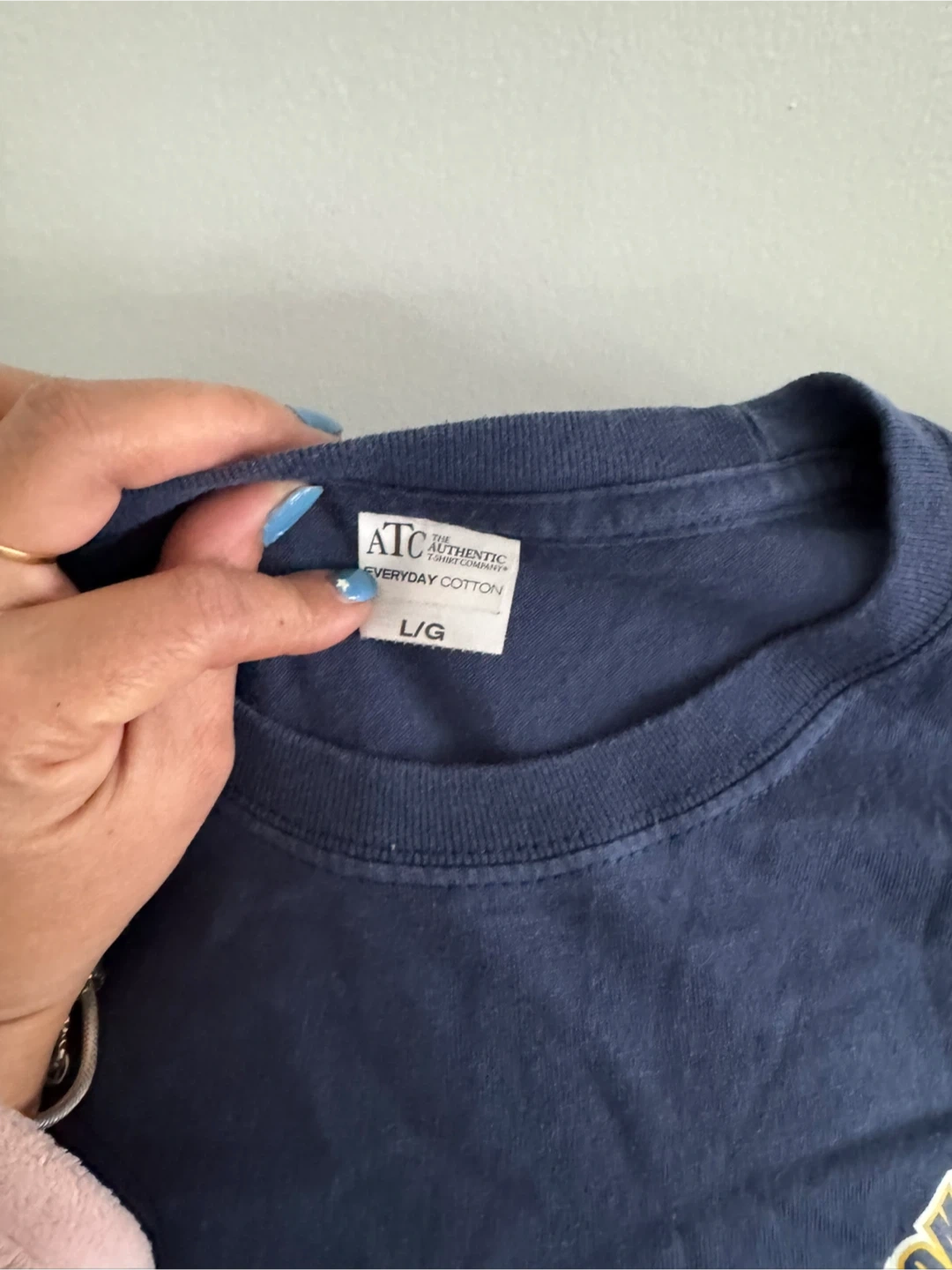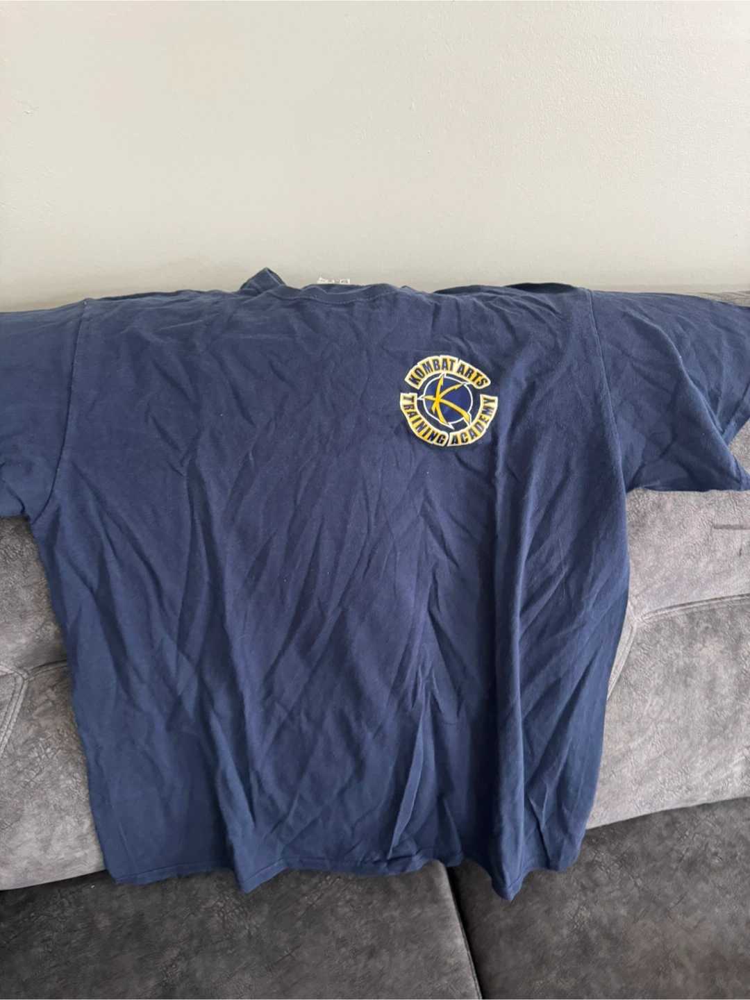 Navy blue t-shirt with a Kombat Arts Training Academy patch. Made from 100% cotton. This shirt is a size large.