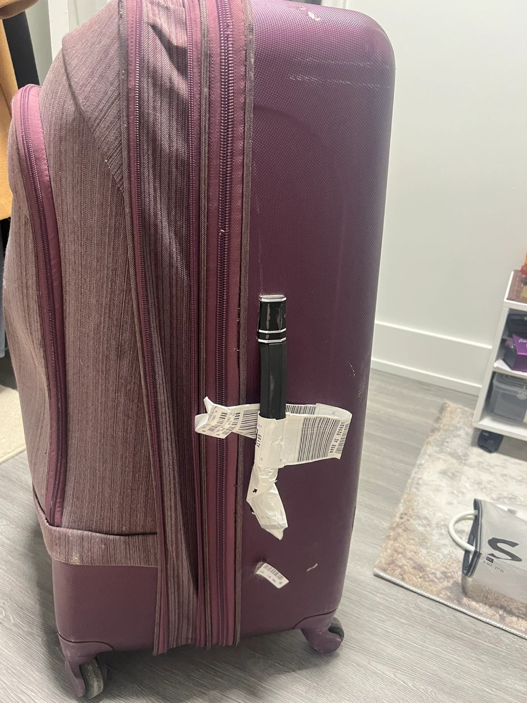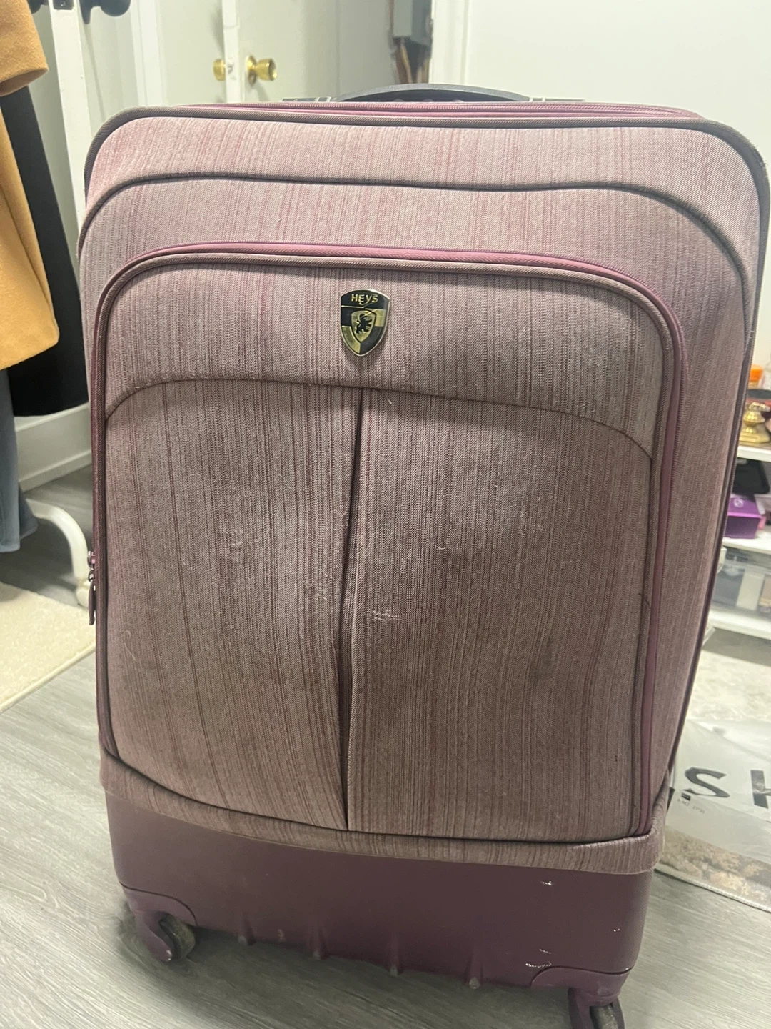 This is a burgundy large hardside suitcase from Heys. It features a striped fabric front panel and sturdy wheels. Plenty of room for your travel essentials!