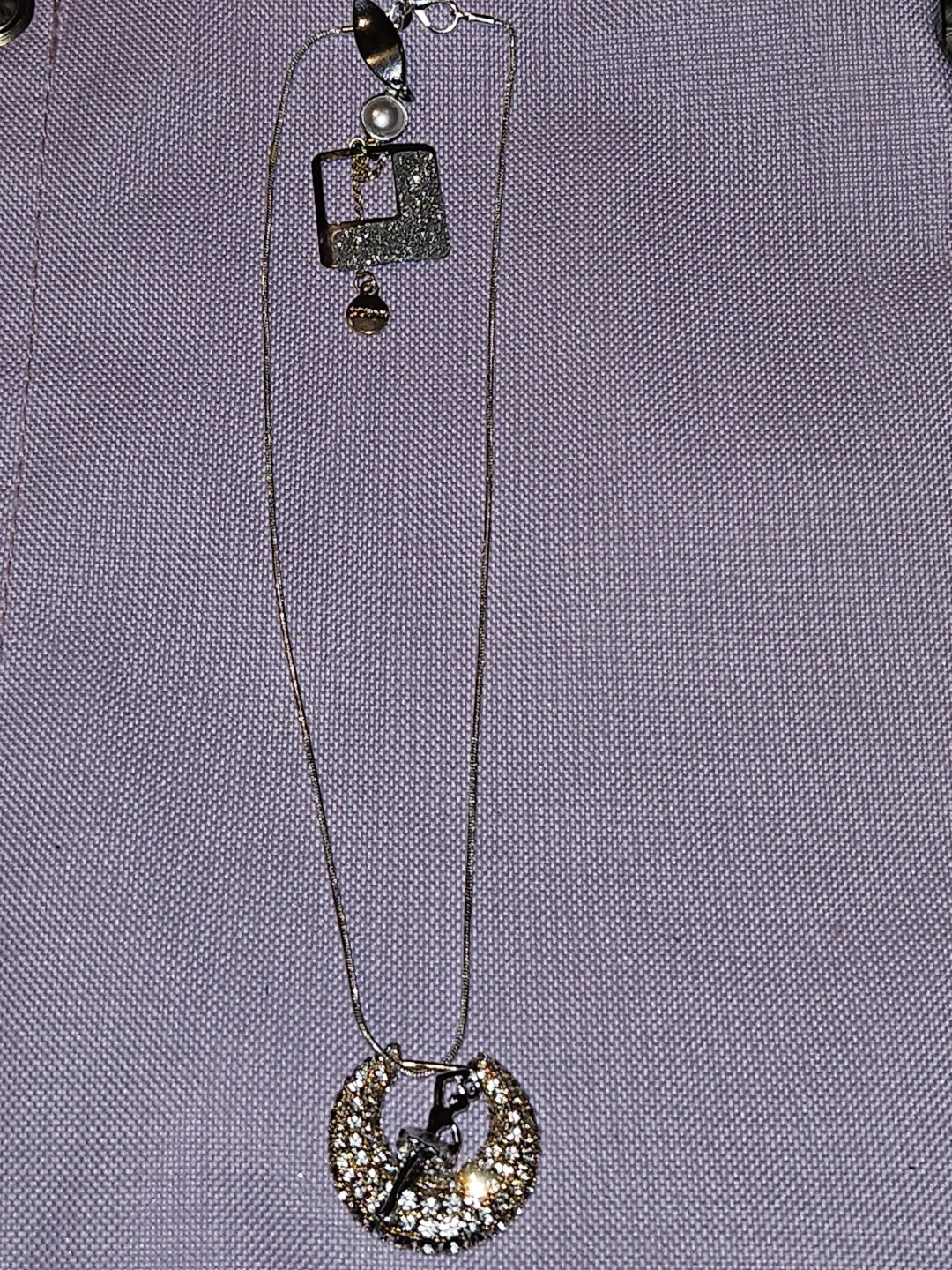 This necklace features a delicate authentic S925 Italian silver a silver ballet dancer pendant inside a sparkly, crystal-encrusted hoop. It also has a detachable square charm with a glittery finish and a small pearl accent. It's a lovely piece for any dancer or lover of unique jewellery!.