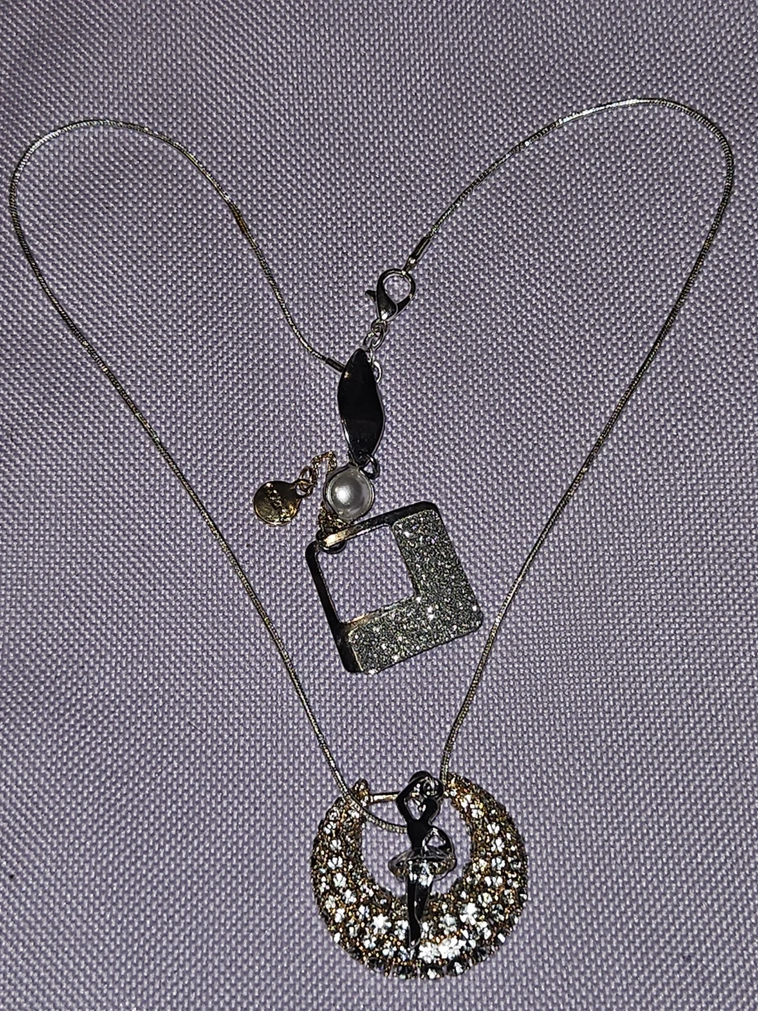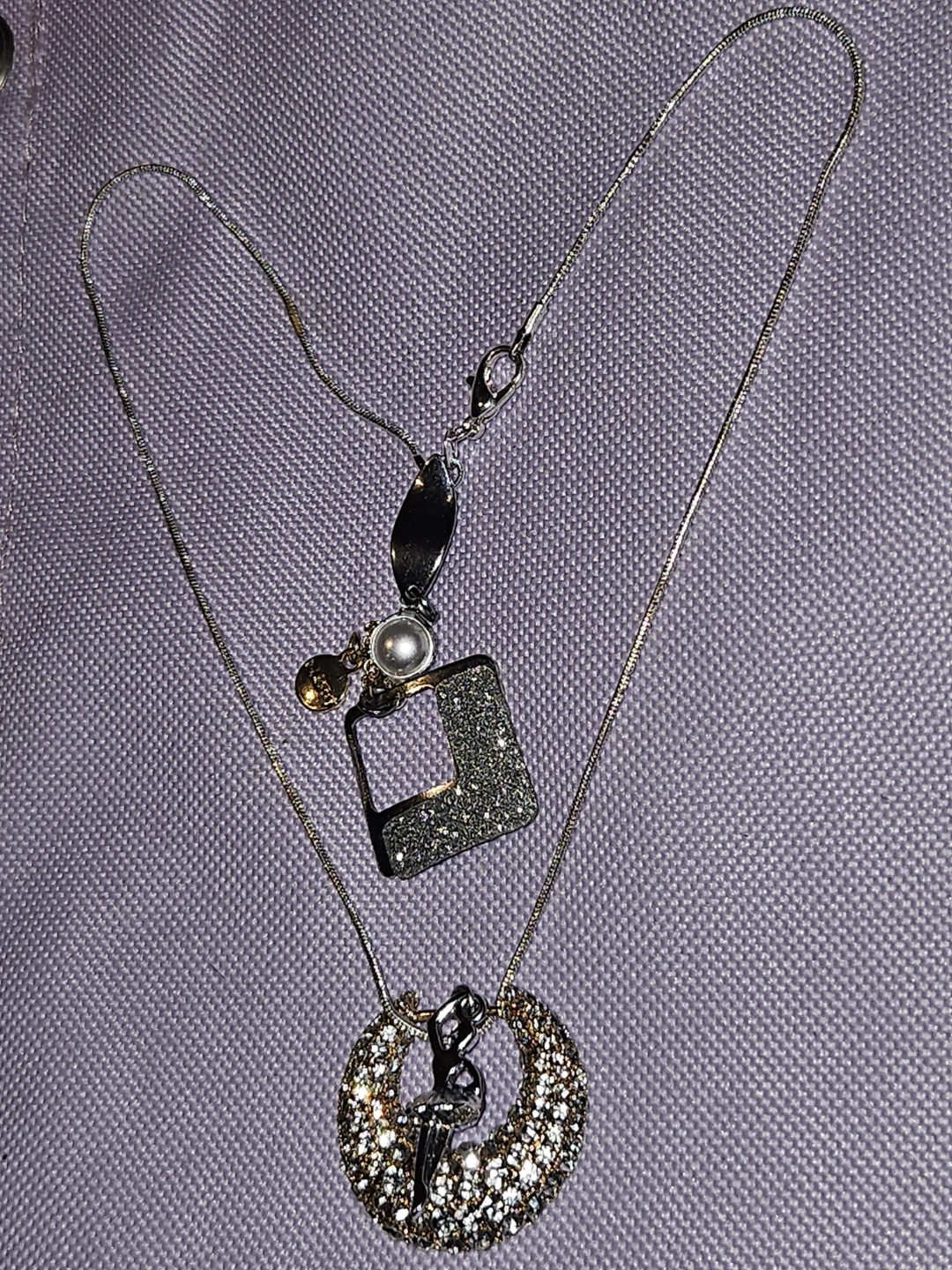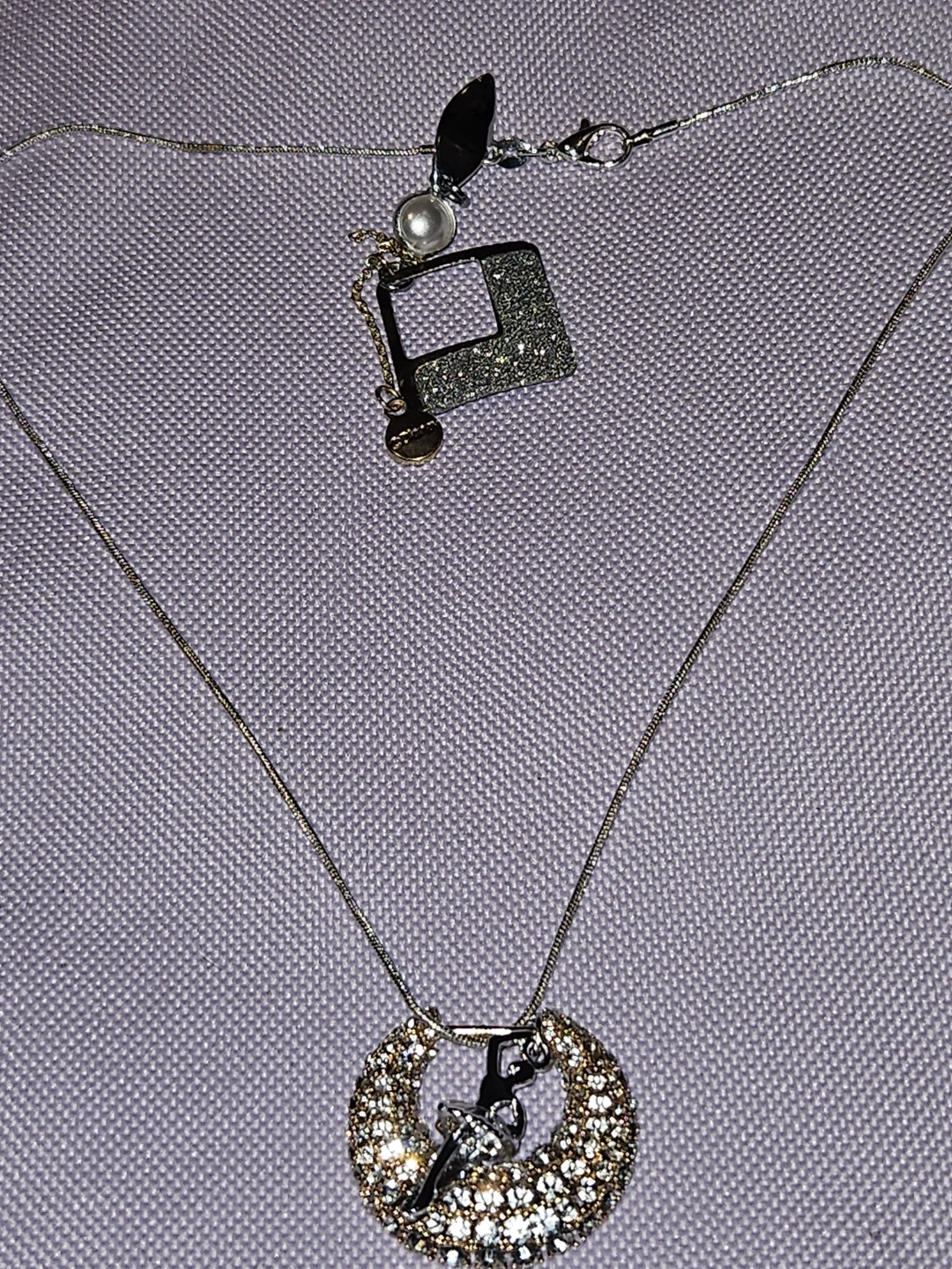 This necklace features a delicate authentic S925 Italian silver a silver ballet dancer pendant inside a sparkly, crystal-encrusted hoop. It also has a detachable square charm with a glittery finish and a small pearl accent. It's a lovely piece for any dancer or lover of unique jewellery!.