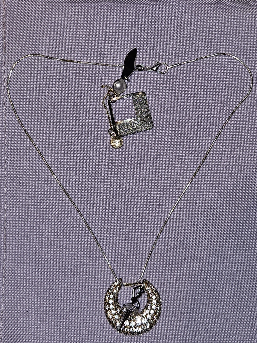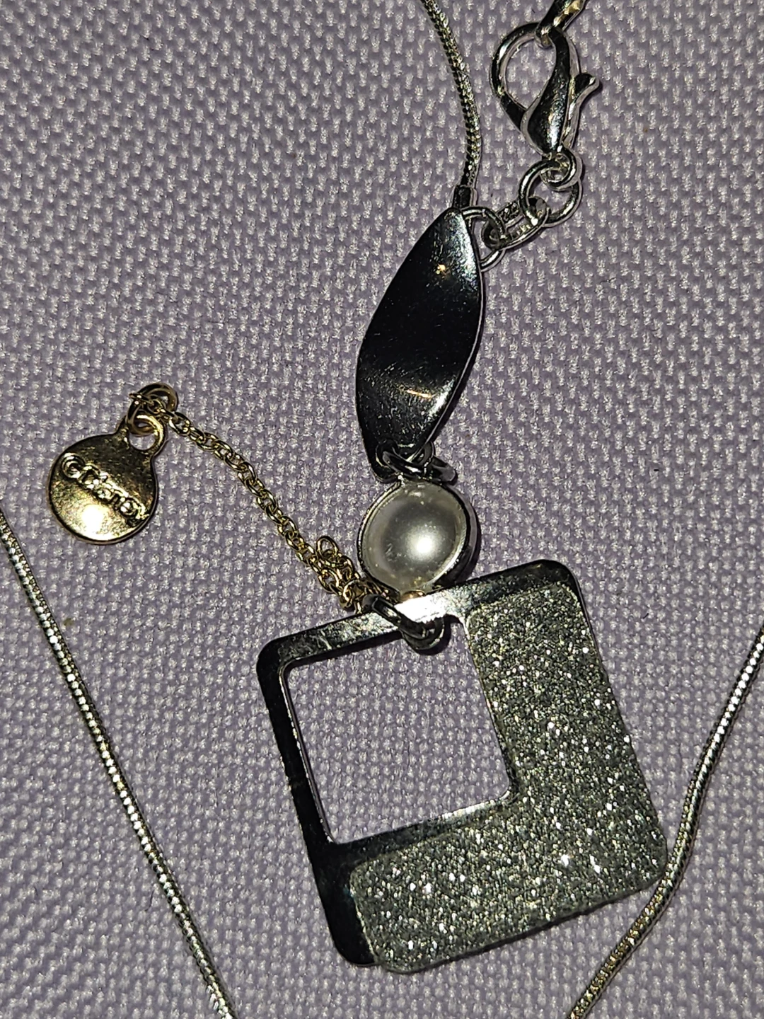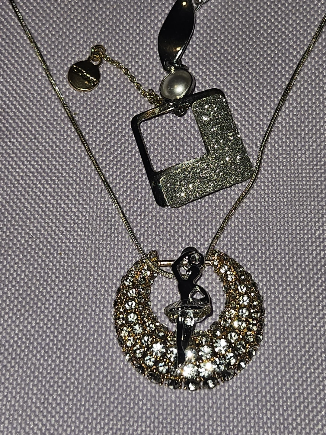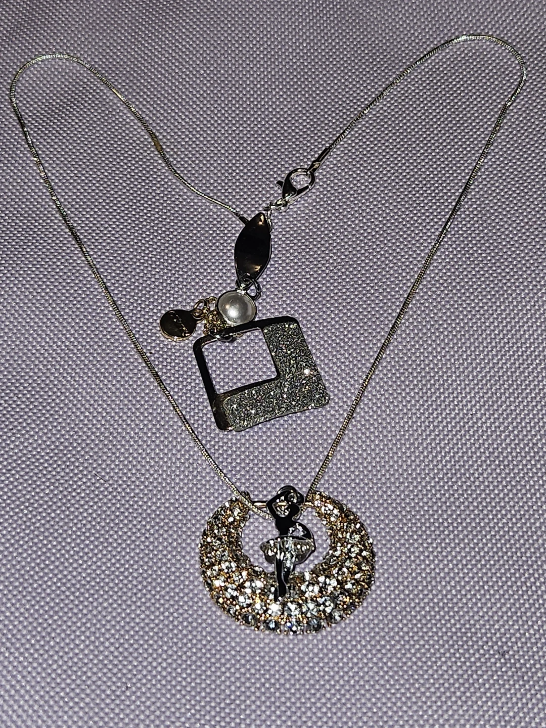 This necklace features a delicate authentic S925 Italian silver a silver ballet dancer pendant inside a sparkly, crystal-encrusted hoop. It also has a detachable square charm with a glittery finish and a small pearl accent. It's a lovely piece for any dancer or lover of unique jewellery!.