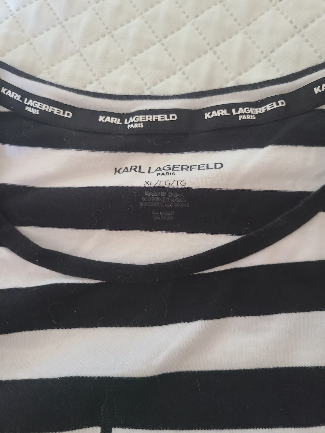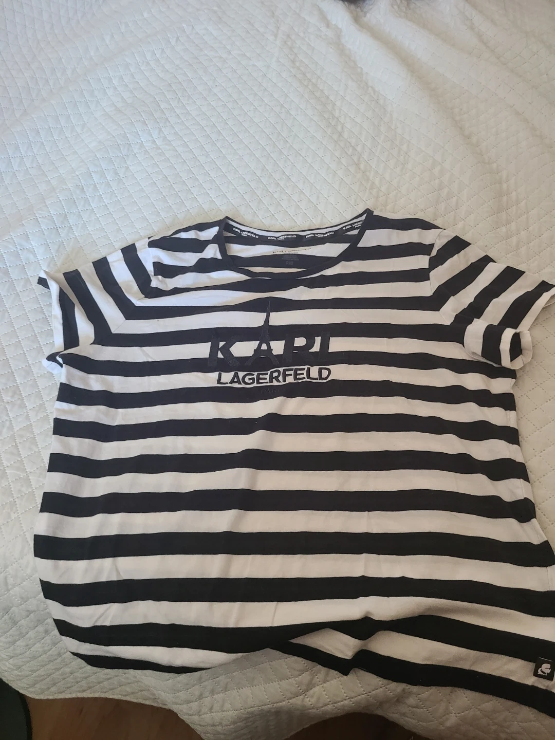 This Karl Lagerfeld Paris t-shirt features classic black and white stripes. It's a size XL/EG/TG. Made from a comfortable fabric for everyday wear. Worn only once or twice.