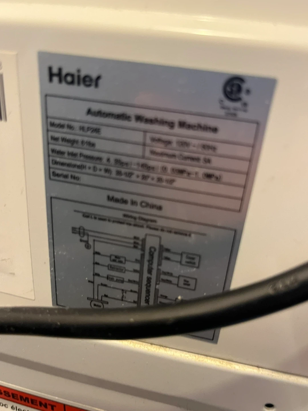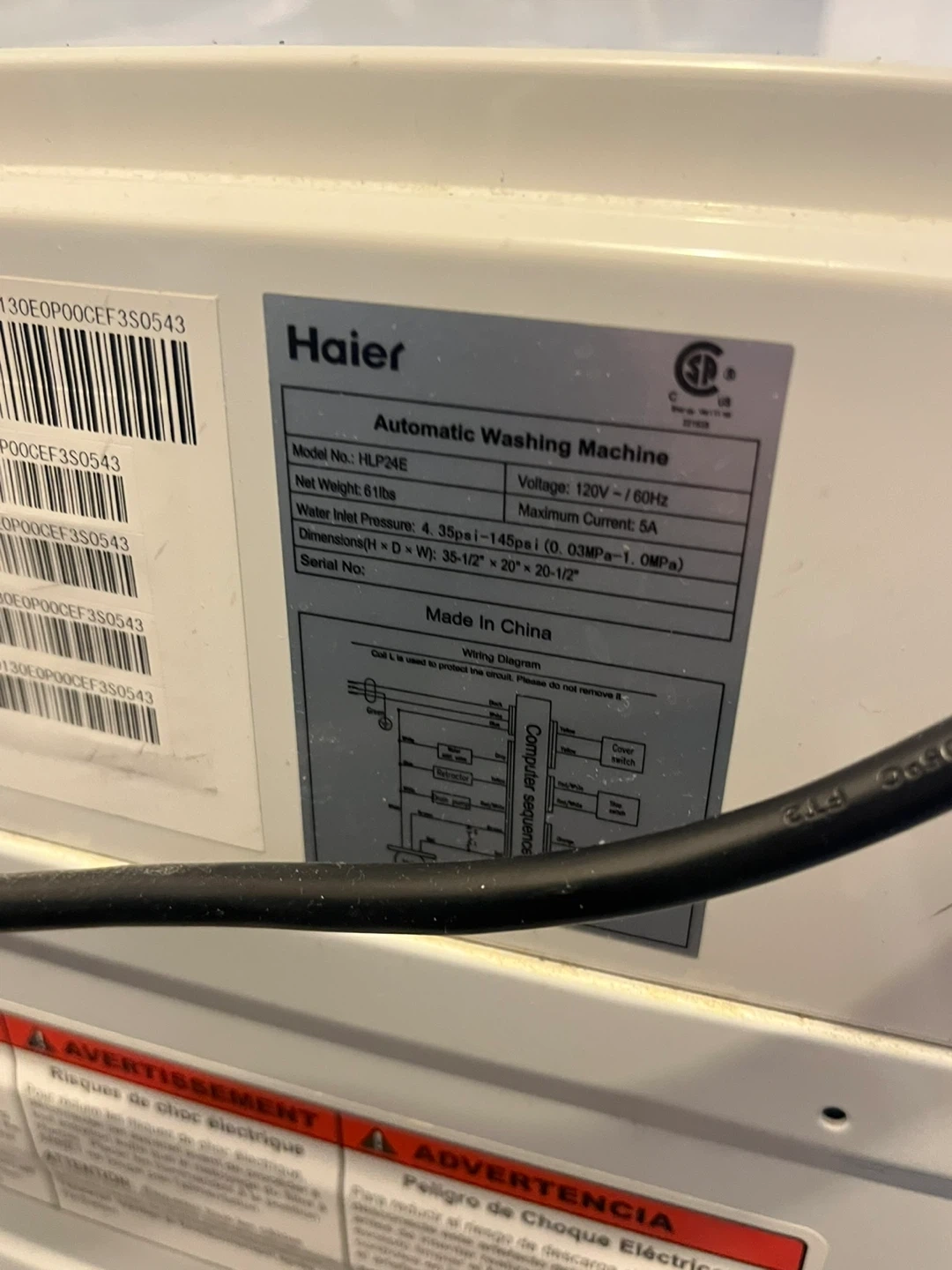 Selling a Haier automatic washing machine, model HLP24E. It's in good working condition and ready to go! Dimensions are 35-1/2" x 20" x 20-1/2".