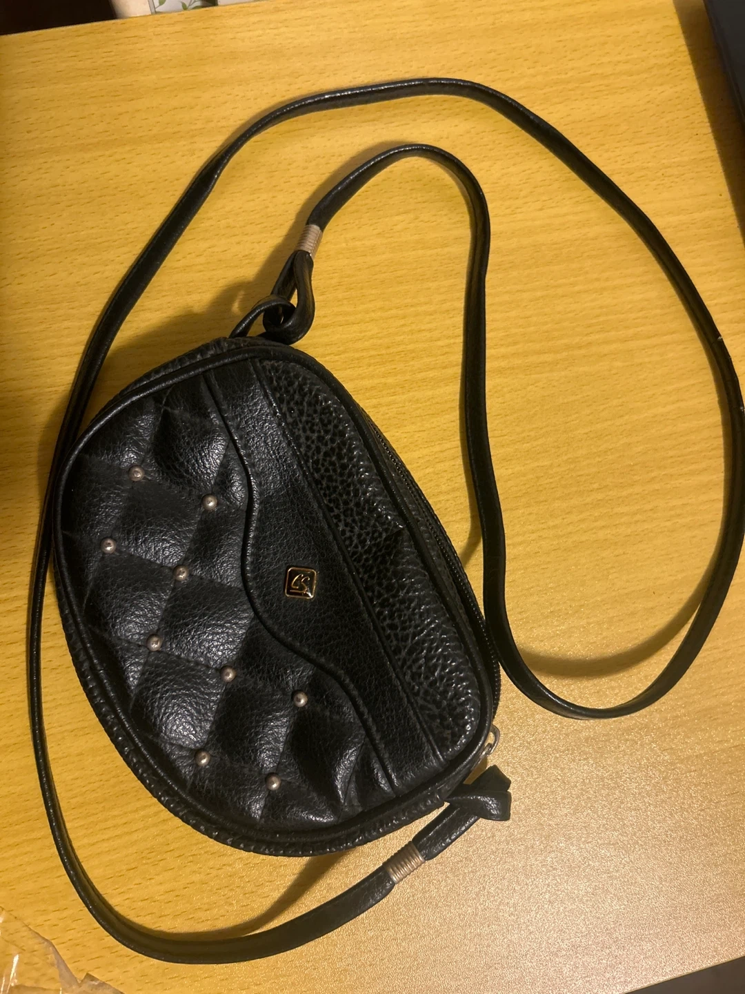 Small black shoulder bag with a quilted front panel adorned with silver studs. It has a long adjustable strap. Faux leather material.