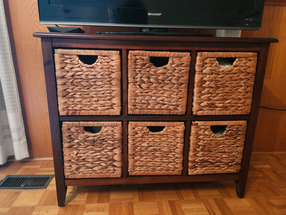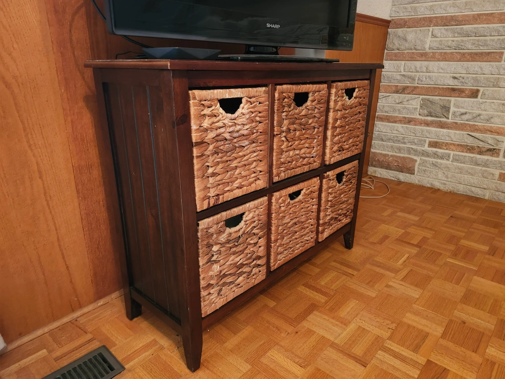 A lovely wood storage cabinet. It features six wicker baskets, offering ample space for organizing your belongings.