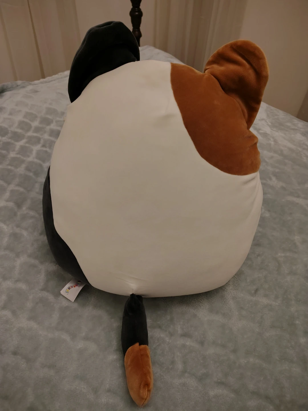 This is a cute Squishmallows plush toy shaped like a calico cat. It's super soft and cuddly! It makes a great addition to any stuffed animal collection. Basically new, put away in storage. Medium size