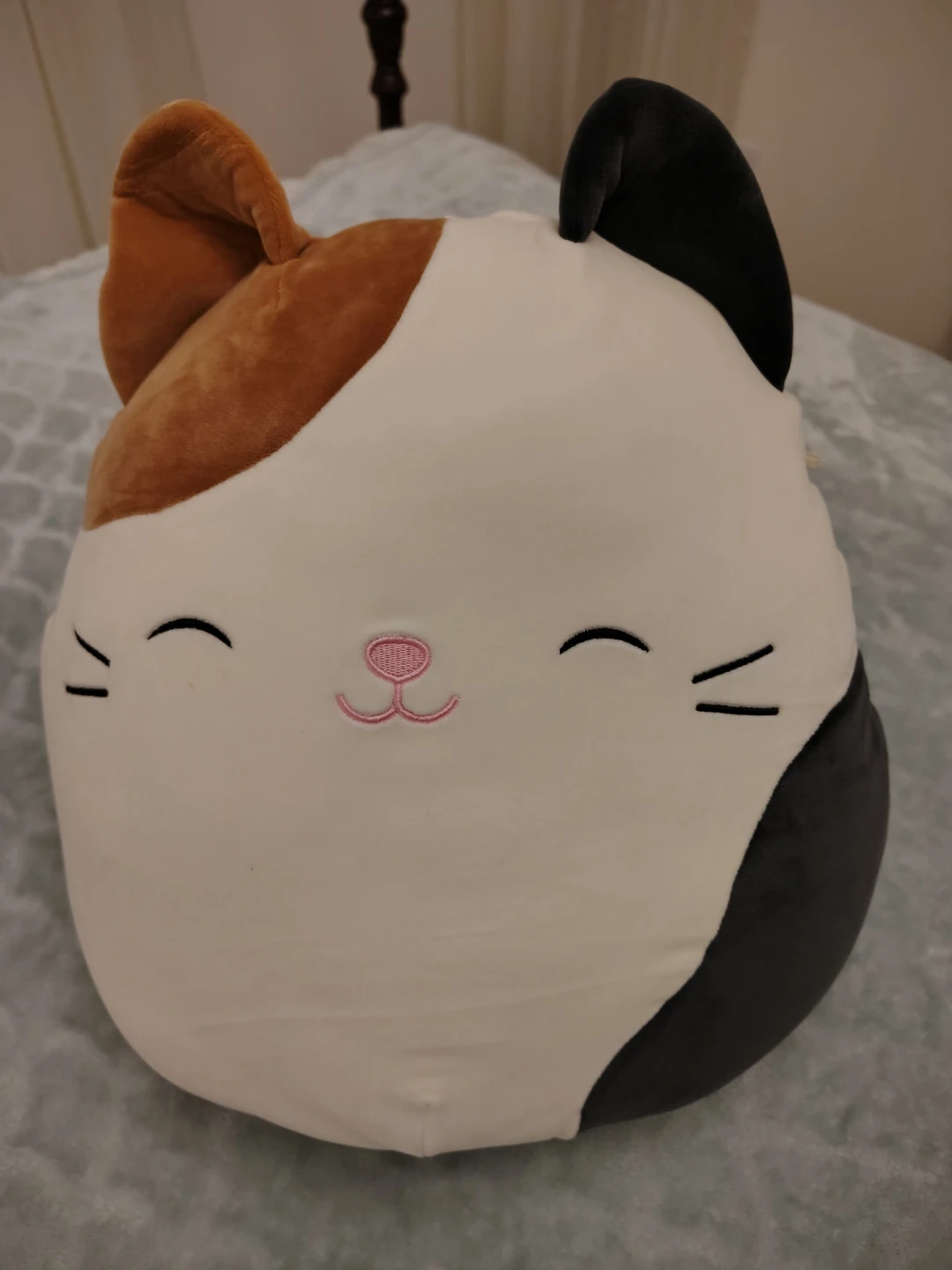 This is a cute Squishmallows plush toy shaped like a calico cat. It's super soft and cuddly! It makes a great addition to any stuffed animal collection. Basically new, put away in storage. Medium size