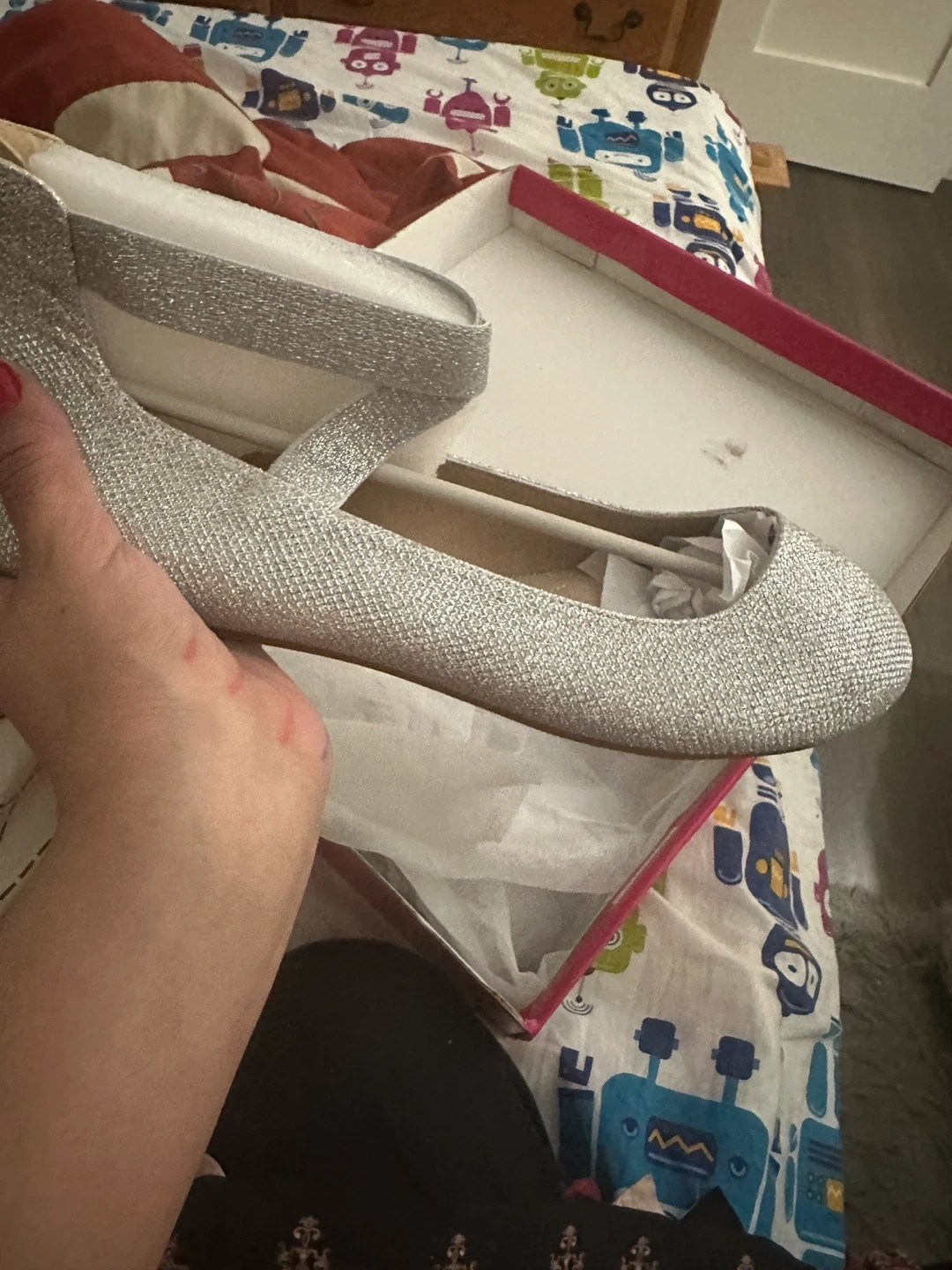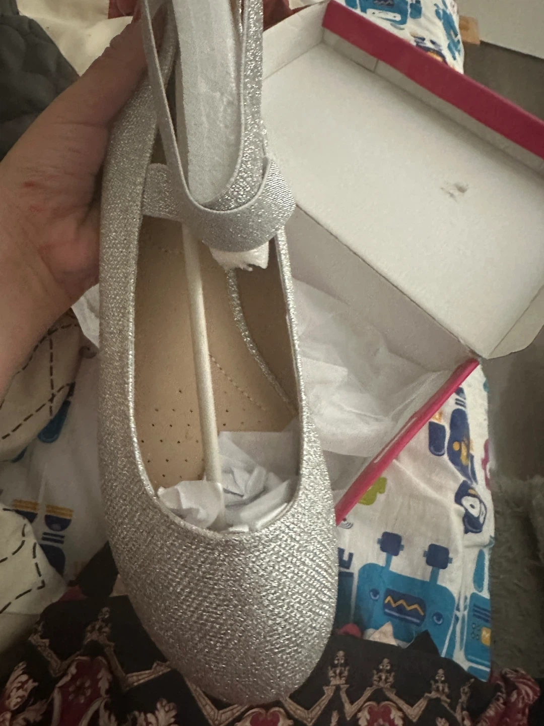 Brand new silver glitter ballet flats with an ankle strap. These are a US size 11 (EUR 42, UK 9). Made in China. Perfect for parties or special occasions!